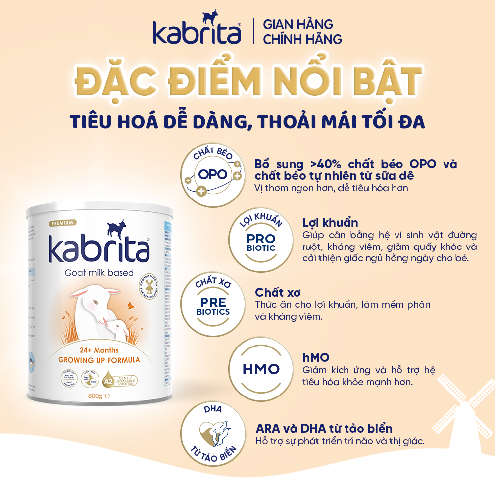 Sữa dê Kabrita với những đặc tính dịu nhẹ có sẵn từ sữa dê, cùng những sáng tạo tân tiến độc quyền, tạo nên một sản phẩm dinh dưỡng dịu nhẹ tối ưu cho hệ tiêu hóa còn non nớt của bé. Hàng triệu ba mẹ trên thế giới đã tin dùng sữa dê Kabrita cho con mình.