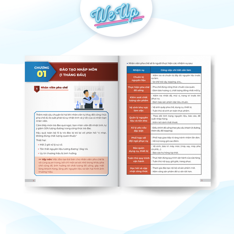 Mua tại Tiktok- Sách - Full bộ mẫu đào tạo nhân sự trong 4 tháng đầu làm việc Thông tin chi tiết Công ty phát hành: CÔNG TY TNHH WE UP Nhà xuất bản: Dân Trí Tác giả: WEUPBOOKS Năm xuất bản: 2025 Số trang: 172 Nội dung sách: PHẦN 1: Bộ mẫu đào tạo nhóm lao động phổ thông Hướng dẫn đào tạo nhân viên trong các ngành nghề... Chia thành 3 giai đoạn: Nhập môn (tháng đầu), phát triển (tháng thứ 2), nâng cao (sau khi chính thức). PHẦN 2: Bộ mẫu đào tạo nhóm nhân viên văn phòng Lộ trình đào tạo bài bản cho nhân viên mới làm việc tại bộ phận hành chính, kế toán, CSKH, marketing... PHẦN 3: Bộ mẫu đào tạo nhóm leader / quản lý nhóm Cách đào tạo nhân sự cấp trung: xây dựng năng lực quản lý – lập kế hoạch – giám sát công việc – đánh giá KPI. HỆ THỐNG BIỂU MẪU - CHECKLIST - LỘ TRÌNH RÕ RÀNG: Mẫu checklist công việc theo ngày cho từng vị trí: nhân viên pha chế, nhân viên bếp, nhân viên phục vụ… Hướng dẫn thực hành cụ thể từng ngày, từng tuần. Đầy đủ công cụ hỗ trợ u, bảng KPI đánh giá, công cụ phản hồi...