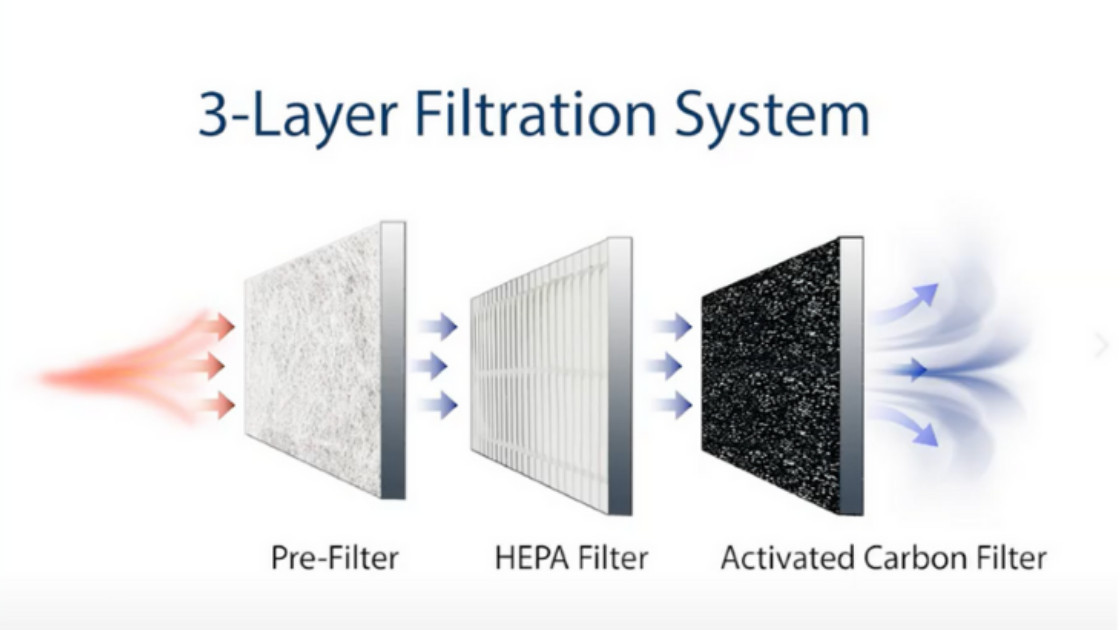 Hệ thống lọc trong Máy lọc khí cho phép loại bỏ những thành phần có hại trong không khí với mỗi lớp lọc là thêm một tính năng loại bỏ những phần tử riêng biệt và cuối cùng mang đến một bầu không khí hoàn toàn vệ sinh.