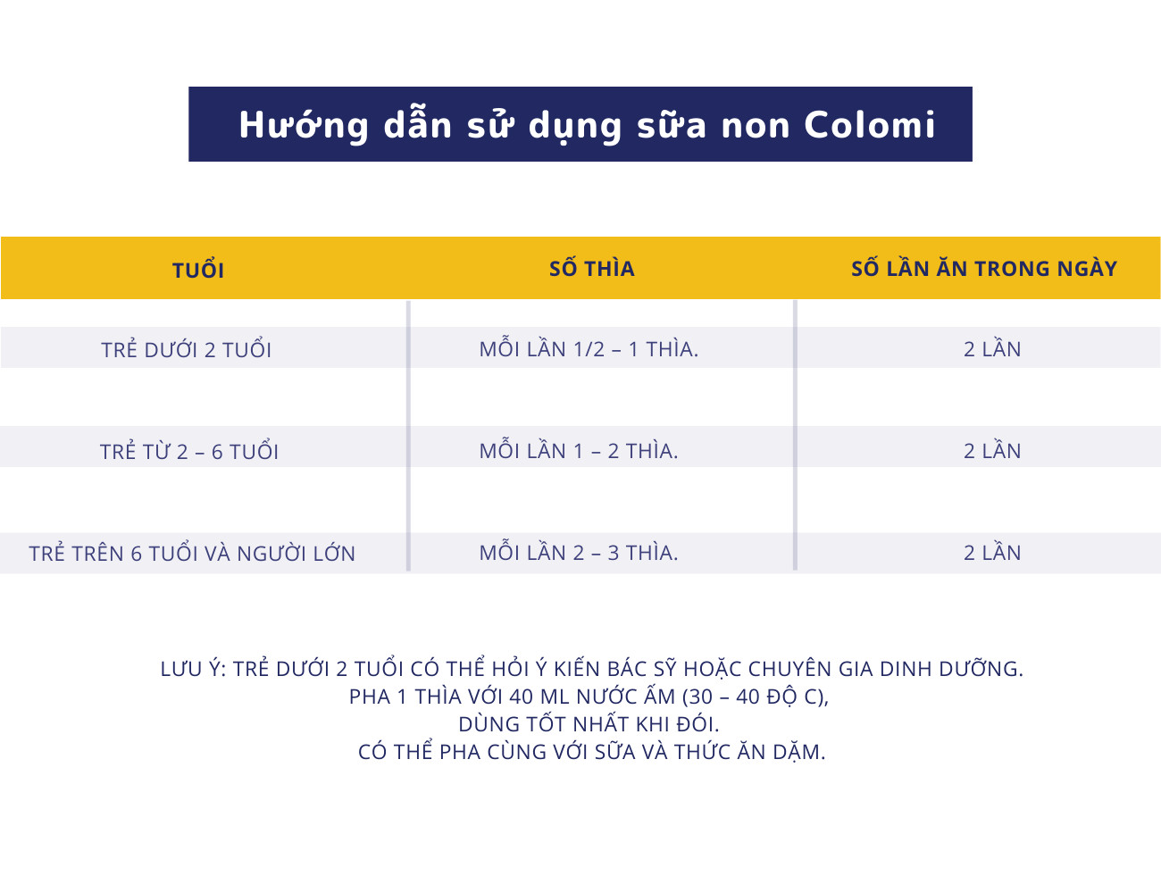 Sữa non cao cấp Colomi tốt cho trẻ cần tăng trưởng toàn diện, trẻ hay ốm vặt, biếng ăn, trẻ sinh non, ít bú mẹ…   3 ĐIỂM NỔI BẬT CỦA SỮA NON CAO CẤP COLOMI   • Sữa non cao cấp Colomi góp phần giúp trẻ tăng sức đề kháng, hạn chế ốm vặt nhờ các kháng thể quý như IgG, IgM, Lactoferrin… • Sữa non cao cấp Colomi góp phần giúp trẻ có hệ tiêu hoá khoẻ mạnh, tăng hấp thu, ăn ngon mỗi ngày nhờ bộ đôi chất xơ FOS và Inulin. • Sữa non cao cấp Colomi bổ sung thành phần Lysine góp phần giúp hấp thu canxi, tạo collagen để giúp quá trình tạo mô liên kết của da, xương, sụn, giúp thúc đẩy và phát triển chiều cao, cân nặng.   BÉ KHOẺ - MẸ AN TÂM KHI MUA SỮA NON CAO CẤP COLOMI   • Sữa non cao cấp Colomi có nguồn nguyên liệu sữa non được Tập đoàn DETECH nhập khẩu trực tiếp từ Tập đoàn APS Labelle (Mỹ). APS Labelle là tập đoàn hàng đầu về cung cấp nguồn sữa non trên thế giới. • Sữa non cao cấp Colomi được sản xuất theo tiêu chuẩn GMP và được phân phối bởi Tập đoàn DETECH. Tập đoàn DETECH thành lập 1991 (30 năm) với bề dày về nhập khẩu, sản xuất và thương mại. • Sữa non cao cấp Colomi lưu hành tại thị trường Việt Nam được cấp phép bởi Bộ Y tế. • Đội ngũ chuyên gia, đội ngũ tư vấn chuyên nghiệp luôn đồng hành vì sự phát triển của bé yêu của bạn.   MỖI THÁNG BÉ DÙNG BAO NHIÊU SỮA NON COLOMI?   Sữa non cao cấp Colomi là thực phẩm bổ sung, do vậy căn cứ vào liều lượng sử dụng, tuỳ theo độ tuổi, trẻ có thể dùng ở định mức tham khảo dưới đây: • Trẻ dưới 2 tuổi: Mỗi tháng dùng khoảng 1 hộp sữa non Colomi loại 130g hoặc 200g • Trẻ 2-6 tuổi: Mỗi tháng dùng khoảng 1 hộp sữa non Colomi loại 350g (Xem chi tiết hướng dẫn sử dụng trên nhãn sản phẩm)