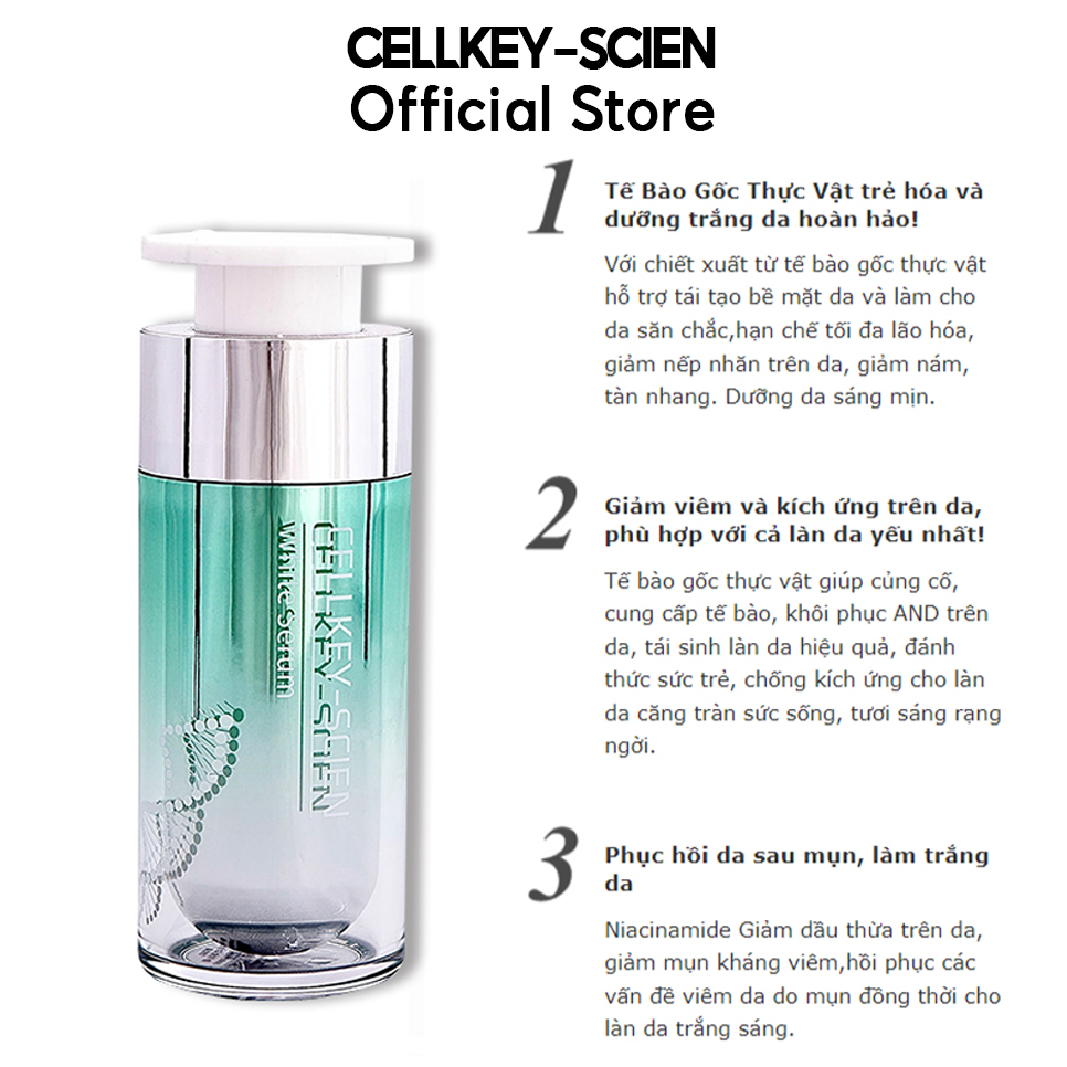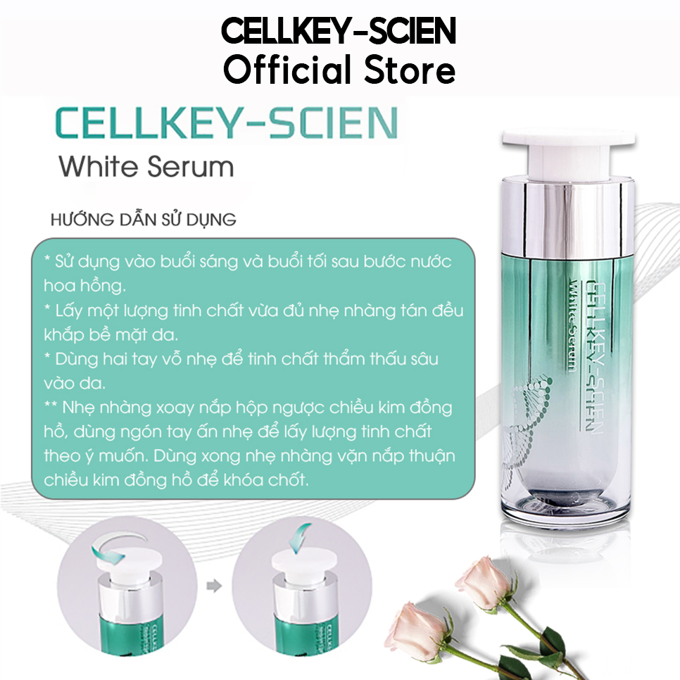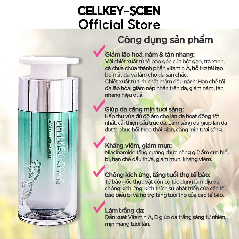 Cellkey-Scien White Serum – Tinh Chất Tế Bào Gốc Tái Tạo Phục Hồi Trẻ Hóa Dưỡng Trắng Da Hoàn Hảo! Chăm sóc da từ tế bào gốc hiện đang trở thành xu hướng chăm sóc da thời đại mới trên toàn thế giới. Cellkey-Scien White Serum đặc biệt bởi chiết xuất từ TẾ BÀO GỐC THỰC VẬT, nói KHÔNG với các sản phẩm từ ĐỘNG VẬT. Giúp củng cố, cung cấp tế bào gốc, khôi phục AND trên da, tái sinh làn da hiệu quả, đánh thức sức trẻ, chống kích ứng cho làn da căng tràn sức sống, tươi sáng rạng ngời.  Mỗi một sản phẩm của Cellkey-Scien đều là những trăn trở, tâm huyết của chúng tôi về làn da phụ nữ. Cellkey-Scien là thương hiệu lấy nguồn Tế Bào Gốc từ thực vật làm trung tâm, mà Cellkey-Scien White Serum là sản phẩm tiêu biểu và trọn vẹn nhất cho dòng công nghệ cao này! Cùng Cellkey-Scien tìm hiểu xem Tế Bào Gốc thực vật có gì đặc biệt nhé! Một số nghiên cứu đã chỉ ra rằng tế bào gốc thực vật cũng có những chức năng tương tự như tế bào gốc của người hay động vật. Các sản phẩm dưỡng da có chứa tế bào gốc thực vật mang lại khả năng bảo vệ da khỏi các tác nhân oxi hoá ngoài môi trường, hạn chế sự phát triển của các gốc tự do, giúp ngăn ngừa lão hoá da. Ngoài ra, tế bào gốc thực vật còn có tác dụng làm dịu da, chống kích ứng, kích thích sự phát triển của các tế bào biểu bì và hỗ trợ tăng tuổi thọ của các tế bào. THÀNH PHẦN TINH CHẤT TẾ BÀO GỐC TÁI TẠO PHỤC HỒI TRẺ HÓA DA CẤP ẨM DƯỠNG TRẮNG CHỐNG LÃO HÓA CELLKEY SCIEN WHITE SERUM: Chiết xuất từ tế bào gốc của bột gạo, trà xanh, cà chua chứa thành phần Vitamin A-B-C, Lecithin, Sodium Hyaluronate, Niacinamide, Nước tinh khiết, Butylene Glycol, Alcohol Denat. Cyclopentasiloxane, Glycerin, Niacinamide, Cetyl Ethylhexanoate, PEG/PPG-17/6 Copolymer, Cetearyl Olivate, Dimethicone, Sorbitan Olivate, Dimethicone/Vinyl Dimethicone Crosspolymer, Trehalose, Betaine, Carbomer, Acrylates/C10-30 Alkyl Acrylate Crosspolymer, Phenyl Trimethicone, Tromethamine, Phenoxyethanol, Chlorphenesin, Ethylhexylglycerin, Caprylyl Glycol, Fragrance, Oryza Sativa (Gạo), Solanum Lycopersicum (Cà chua), Benzophenone-5, Alcohol, Disodium EDTA, Natri Hyaluronate, Chiết xuất nuôi cấy mô sẹo Camellia Sinensis, Chiết xuất nuôi cấy mô sẹo Leontopodium Alpinum, Xanthan Gum, Chiết xuất Usnea Barbata (Địa y), Chiết xuất quả Zanthoxylum Piperitum, Chiết xuất Pulsatilla Koreana, Lecithin, CI 42090, CI 19140…và một số thành phần đắt giá khác. CÔNG DỤNG TINH CHẤT TẾ BÀO GỐC TÁI TẠO PHỤC HỒI TRẺ HÓA DA CẤP ẨM DƯỠNG TRẮNG CHỐNG LÃO HÓA CELLKEY SCIEN WHITE SERUM: