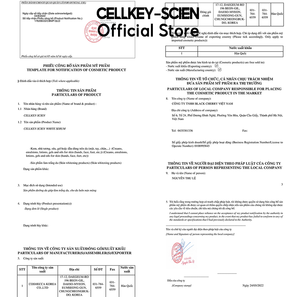 • Làm trắng da: Dẫn xuất vitamin A, B giúp da trắng sáng tự nhiên, tươi tắn. *** Đặc biệt sản phẩm phù hợp với mọi loại da, kể cả làn da kích ứng và mẫn cảm nhất hay làn da bị tổn thương sau các liệu trình làm đẹp. HƯỚNG DẪN SỬ DỤNG TINH CHẤT TẾ BÀO GỐC TRẺ HÓA DƯỠNG TRẮNG DA CELLKEY SCIEN: Lưu ý: Sau khi sử dụng đóng kín nắp sản phẩm, bảo quản nơi thoáng mát và tránh tiếp xúc trực tiếp với ánh nắng mặt trời. THÔNG TIN THƯƠNG HIỆU: Dòng sản phẩm tế bào gốc thực vật CELLKEY-SCIEN được tập đoàn COSMECCA (Một trong ba tập đoàn sản xuất mỹ phẩm lớn nhất tại Hàn Quốc)  nghiên cứu và sản xuất. Tại Việt Nam, Công ty TNHH BLACK CHERRY VIỆT NAM là đơn vị nhập khẩu và phân phối duy nhất. Đặc biệt dòng sản phẩm tế bào gốc thực vật Cellkey-Scien này đã được cấp Giấy chứng nhận bảo hộ thương hiệu. Xuất xứ thương hiệu: Hàn Quốc Nơi sản xuất: Hàn Quốc Dung tích: 60ml NSX & HSD: MFD là ngày sản xuất, in trên vỏ sản phẩm - 03 năm kể từ ngày sản xuất. CELLKEY-SCIEN OFFICIAL - STORE CHÍNH HÃNG