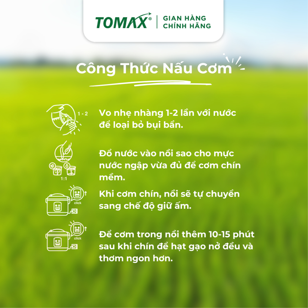 • Chất béo: 0.52 - 0.78% Xuất xứ: Nhà máy công ty cổ phần Gavi Đơn vị phân phối: Công Ty TNHH TOMAX Holding Khối lượng tịnh: Túi 5kg Hạn sử dụng: 12 tháng kể từ ngày sản xuất Bảo quản: Nơi khô ráo, tránh ánh nắng trực tiếp. Cảnh báo: Không sử dụng sản phẩm đã hết hạn sử dụng hoặc có dấu hiệu mốc. Bí quyết nấu Gạo Đài Thơm Tomax Rice Bước 1: Vo gạo nhẹ nhàng với nước sạch 1-2 lần, sau đó cho vào nồi cơm điện. Bước 2: Đậy nắp và bật chế độ nấu. Khi cơm chín, nồi sẽ tự động chuyển sang chế độ giữ ấm. Ủ cơm thêm 10-15 phút để cơm chín đều và ngon hơn. Hãy chọn Gạo Đài Thơm Tomax Rice để nấu bữa cơm dẻo thơm vừa miệng, hợp vị cả nhà và đong đầy hạnh phúc nhé!