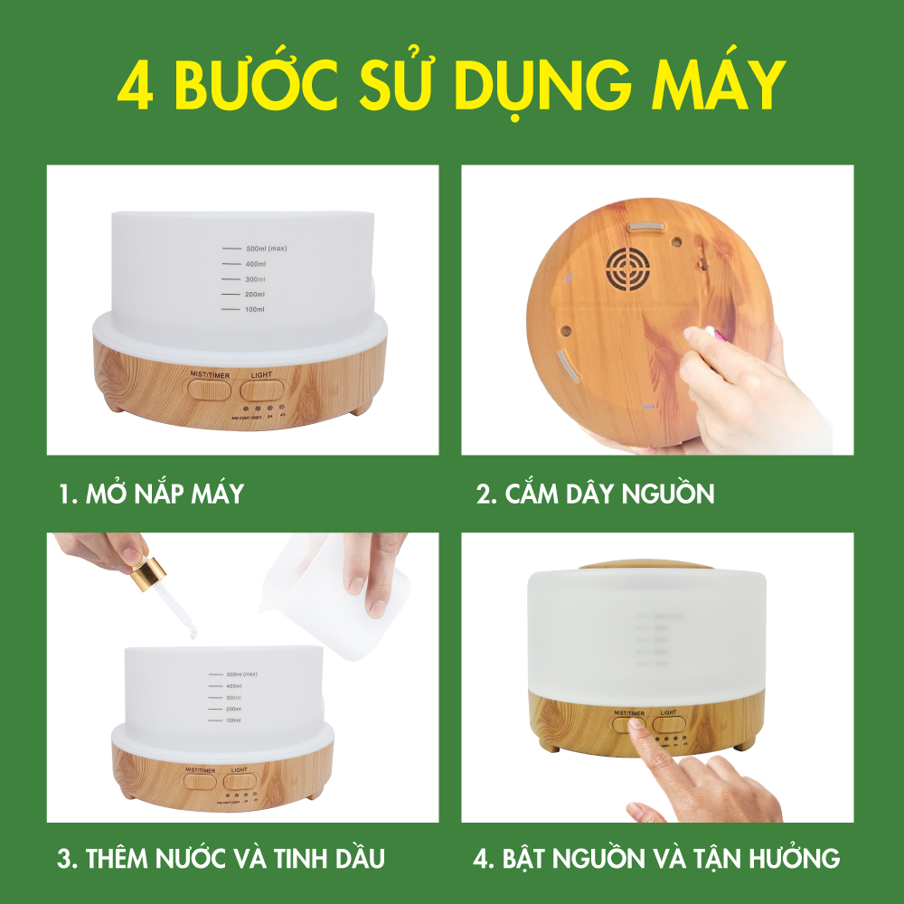 THÔNG TIN SẢN PHẨM - Màu sắc: gỗ sáng, gỗ tối - Kích thước: 17*17*15cm - Chất liệu: Nhựa ABS - Dung tích: 500ml - Trọng lượng: 400g - Công suất: 8W - Diện tích