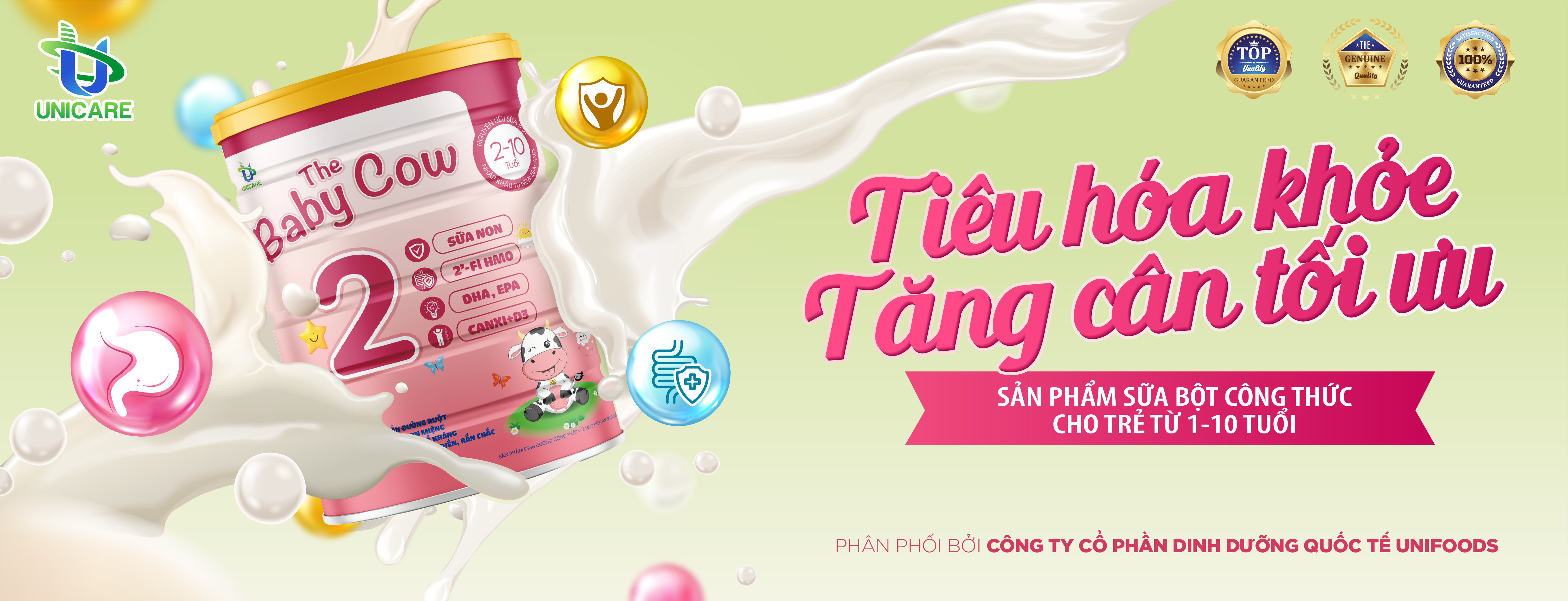 TUYỆT CHIÊU CỦA MẸ NUÔI CON NHÀN TÊNH CÙNG THE BABY COW Bật mí tuyệt chiêu của rất nhiều mẹ bỉm sữa nuôi con khỏe mạnh, ăn ngon miệng, tăng cân đều đặn cùng sữa The Baby Cow Với công thức đặc biệt từ nguồn sữa non quý giá The Baby Cow giúp bé cải thiện biếng ăn, tăng hấp thu: Sữa non: Bảo vệ hệ miễn dịch của con, bổ sung lượng kháng thể hàng đầu chống viêm nhiễm đường tiêu hóa. Lactoferrin: Tăng cường sự hấp thu sắt, góp phần tiêu diệt vi khuẩn cần sắt, đặc biệt quan trọng với hệ tiêu hóa. 2'-FL HMO: Giúp tăng khả năng miễn dịch để con luôn khỏe mạnh trong giai đoạn khoảng trống miễn dịch. Hàm lượng cao FOS giúp tăng cường tiêu hóa, tăng cường hấp thu,Lysine giúp con ăn ngon, tăng cân đều Và còn rất nhiều các dưỡng chất khác cần thiết cho sự phát triển thể chất của con trong giai đoạn này. Sản phẩm được nghiên cứu, thiết kế khoa học để đáp ứng nhu cầu dinh dưỡng và đặc biệt phù hợp với thể trạng trẻ em Việt Nam nên mẹ có thể hoàn toàn yên tâm nhé!