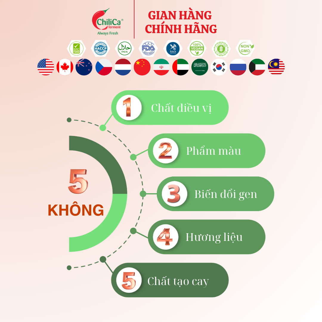 - Phù hợp với mọi món ăn, chay mặn đều dùng được. Hãy thử và cảm nhận! Tương Ớt và Ớt Bằm Chilica được làm từ 100% ớt chỉ thiên chọn lọc, trải qua quá trình lên men tự nhiên kết hợp với công nghệ sản xuất hiện đại, đáp ứng các tiêu chuẩn về vệ sinh an toàn thực phẩm, tạo ra sản phẩm có hương vị đặc biệt thơm ngon, phù hợp với mọi bữa ăn trong gia đình. Tương Ớt và Ớt Bằm Chilica không sử dụng chất tạo màu, tạo mùi, tạo cay, chất độn....Từ khâu đầu tiên đến khâu cuối cùng đều được tự động hóa, giảm thiểu tối đa sự tác động của con người. Chua cay mê ngay: Tương Ớt và Ớt Bằm Chilica là sự kết hợp hài hòa của những nguyên liệu tốt và tự nhiên nhất như: ớt chỉ thiên, giấm, đường, muối... Ớt sau khi xay được đưa vào ủ lên men tự nhiên nên có mùi thơm, vị chua cay thanh rất dễ chịu;đáp ứng mọi tiêu chuẩn khắt khe cũng như khẩu vị của người sành ăn.