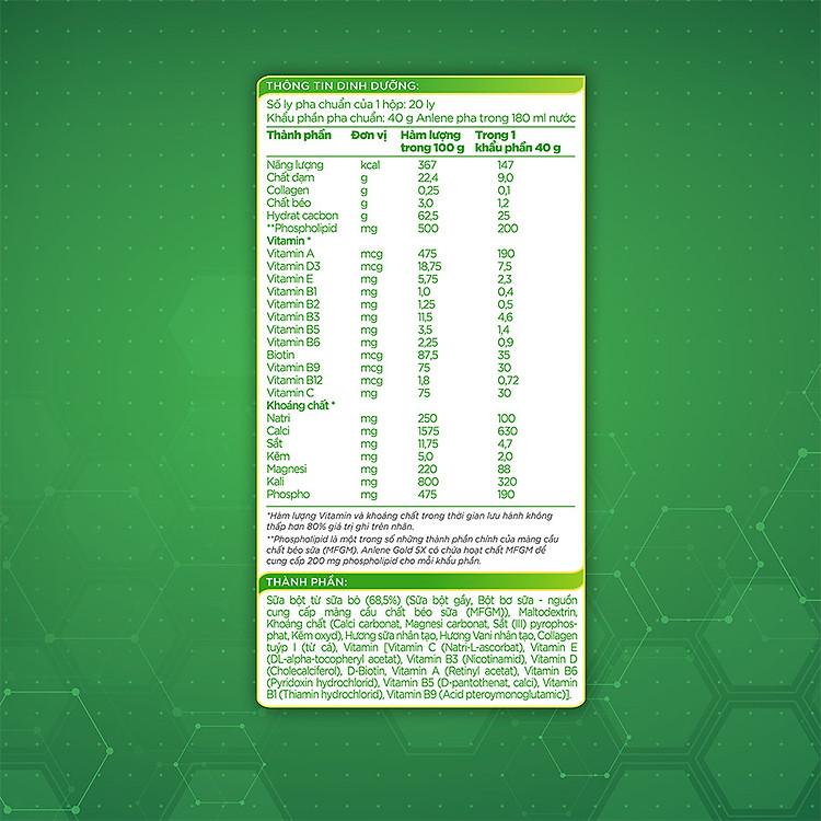 Sữa bột từ sữa bò (68,5%) (Sữa bột gầy, Bột bơ sữa - nguồn cung cấp màng cầu chất béo sữa (MFGMO), Maltodextrin, Khoáng chất (Calci carbonat, Magnesi carbonat, Sắt (III) pyrophosphat, kẽm oxyd), Hương sữa nhân tạo, Hương Vani nhân tạo, Collagen tuýp 1 (từ cá), Vitamin [Vitamin C (Natri-L-ascorbat), Vitamin E (DL-alpha-tocopheryl acetat), Vitamin B3 (Nicotinamid), Vitamin D (Cholecalciferol), D-Biotin, Vitamin A (Retinyl acetat), Vitamin B6 (Pyridoxin hydrochlorid), Vitamin B5 (D-pantothenat, calci), Vitamin B1 (Thiamin hydrochlorid), Vitamin B9 (Acid pteroymonoglutamic)].