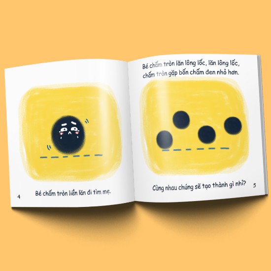 “Chấm tròn ơi đi đâu thế?” kể về cuộc phiêu lưu của bạn chấm tròn vốn nằm trên bộ áo của bạn Cánh Cam, nhưng nhỡ bị “lạc” mất. Trên hành trình đi tìm lại Cánh Cam, Chấm tròn gặp biết bao nhiêu điều bất ngờ, kết hợp cùng các đồ vật khác để thử làm chiếc đèn giao thông, làm chiếc kẹo xinh xắn, làm khinh khí cầu, làm chiếc đốm trên lưng cún,… Những điều mới lạ làm Chấm tròn rất thích thú về thế giới bên ngoài, nhưng cuối cùng bạn ấy vẫn muốn trở về nơi thân thuộc nhất với bản thân mình – chính là trên lưng Cánh Cam.