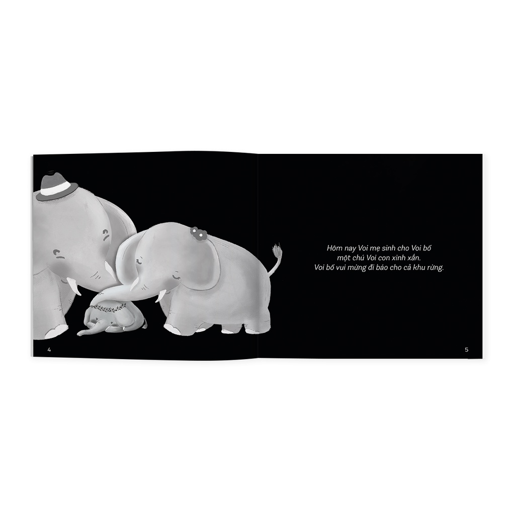 Voi con đến rồi: Gia đình Voi hạnh phúc đón đứa con đầu lòng và muốn chia sẻ niềm vui ấy đến tất cả mọi người trong khu rừng. Voi bố bèn dẫn theo Voi