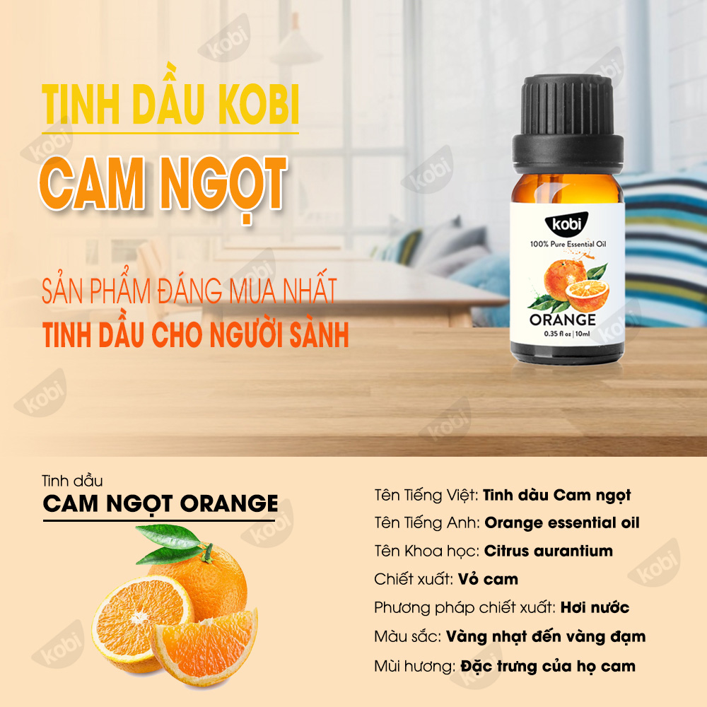 Tinh Dầu Cam Ngọt Kobi (30ml) có thành phần 100% tinh dầu tự nhiên có hương thơm tươi mát, dễ chịu. Tinh dầu cam ngọt mang lại nhiều công dụng tốt cho sức khỏe như làm giảm đau cơ, nhức đầu, hỗ trợ hô hấp, giải tỏa căng thẳng, thư giãn tinh thần. Ngoài ra, tinh dầu cam ngọt còn giúp thanh lọc không khí, khử mùi, cho không gian sống thêm thoải mái. Sản phẩm được chiết xuất từ vỏ cam ngọt 100%, không chất bảo quản, có hương thơm tự nhiên, an toàn và lành tính, tốt cho sức khỏe.