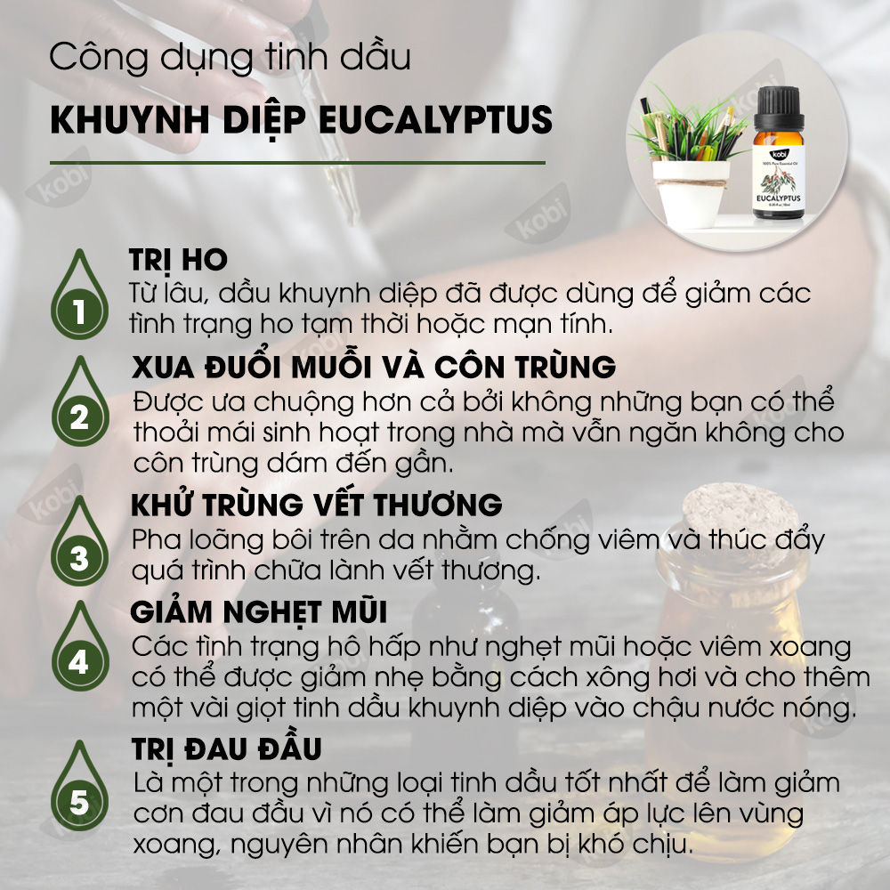 TINH DẦU KHUYNH DIỆP (BẠCH ĐÀN) NGUYÊN CHẤT MỘC MÂY - TINH DẦU NGUYÊN CHẤT TỪ THIÊN NHIÊN ------------------------------------------------------------------- - Mùi hương: nồng ấm, đặc trưng, tươi mát… - Thành phần: 100% tinh dầu được