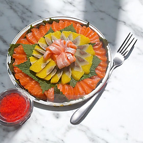 Set bao gồm: 300gram Phile cá hồi cắt sashimi và 160gram cá trích ép trứng, gia vị ăn kèm nước tương nhật, wasabi, gừng hồng.