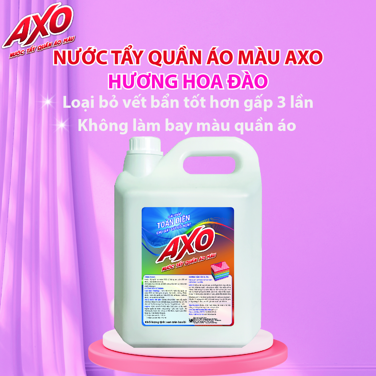 Nước Giặt Tẩy Quần Áo Màu AXO - Với công nghệ từ Philippines, AXO giúp tẩy sạch các vết bẩn trên quần áo màu như Cafe, Cari, dầu nhớt, vết mực, vết bút bi mà