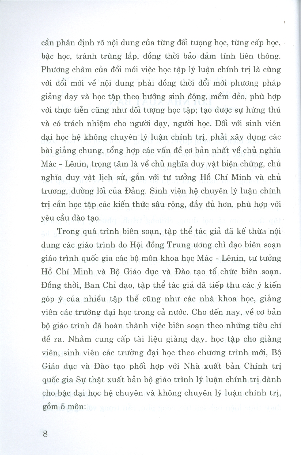 Bộ giáo trình lý luận chính trị gồm 5 cuốn dành cho bậc đại học hệ không chuyên lý luận chính trị.