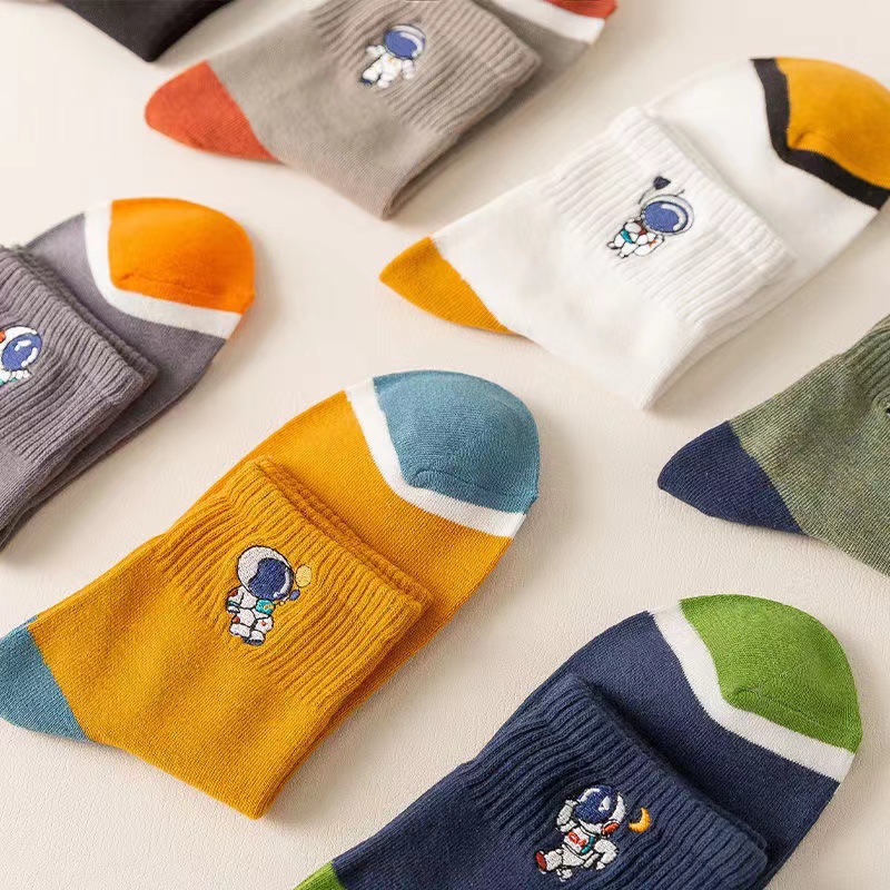 ✨Combo 5 đôi Vớ tất nam cổ trung màu trung tính thêu phi hành gia thông hơi