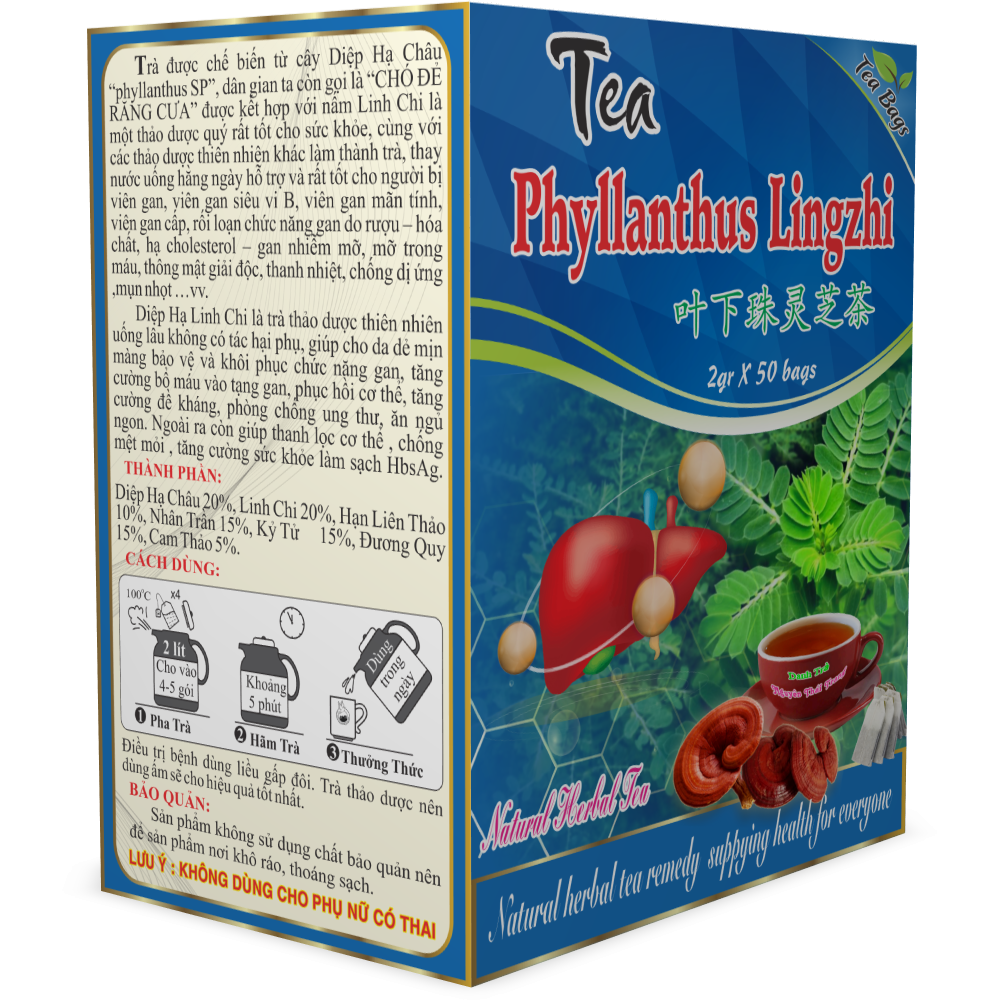 TRÀ DIỆP HẠ LINH CHI      Trà được chế biến từ cây Diệp Hạ Châu “phyllanthus SP”, dân gian ta còn gọi là “CHÓ ĐẺ RĂNG CƯA” được kết hợp với nấm Linh Chi là một thảo dược quý rất tốt cho sức khỏe, cùng với các thảo dược thiên nhiên khác làm thành trà, thay nước uống hằng ngày hỗ trợ và rất tốt cho người bị viên gan, viên gan siêu vi B, viên gan mãn tính, viên gan cấp, rối loạn chức năng gan do rượu – hóa chất, hạ cholesterol – gan nhiễm mỡ, mỡ trong máu, thông mật giải độc, thanh nhiệt, chống dị ứng, mụn nhọt …vv.     Diệp Hạ Linh Chi là trà thảo dược thiên nhiên uống lâu không có tác hại phụ, giúp cho da dẻ mịn màng bảo vệ và khôi phục chức năng gan, tăng cường bổ máu vào tạng gan, phục hồi cơ thể, tăng cường đề kháng, phòng chống ung thư, ăn ngủ ngon. Ngoài ra còn giúp thanh lọc cơ thể, chống  mệt mỏi, tăng cường sức khỏe làm sạch HbsAg.        THÀNH PHẦN: Diệp Hạ Châu 20%, Linh Chi 20%, Hạn Liên Thảo 10%, Nhân Trần 15%, Kỷ Tử    15%, Đương Quy 15%, Cam Thảo 5%. CÁCH DÙNG: Cho túi trà vào tách nước sôi 100oC đậy kín khoảng 3-4 phút là dùng được. Ngày uống từ 4 đến 6 gói có thể cho trực tiếp vào bình thủy uống trong ngày  ( loại trà này nên dùng khi nước trà còn nóng hoặc ấm thì tốt hơn). BẢO QUẢN: Vì không sử dụng hóa chất bảo quản nên để hộp trà nơi khô ráo, thoáng sạch. SẢN XUẤT TẠI: DNTT Trà Thảo Dược Nguyên Thái Trang 01 Phan Đình Phùng, Phường 1, Tp. Đà Lạt, Lâm Đồng HẠN SỬ DỤNG: