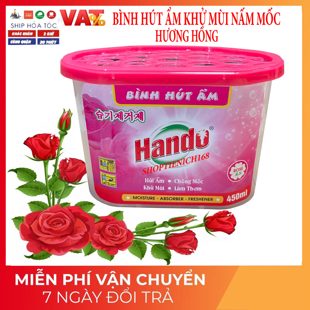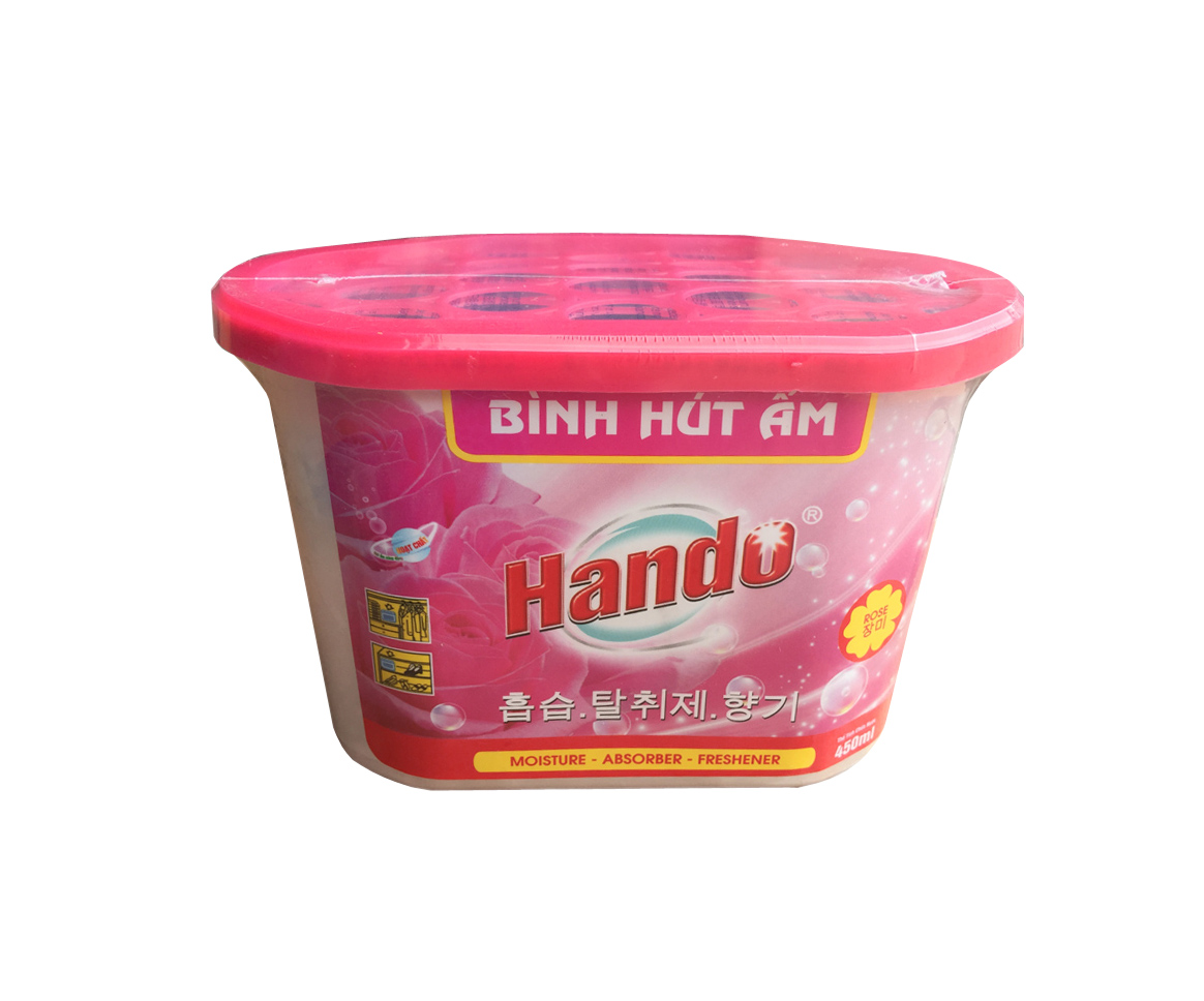 Thông số sản phẩmTên sản phẩm : Bình hút ẩm Hando 450mlHướng dẫn sử dụng    : Mở nắp, lột bỏ lớp giấy bạc, giữ lớp giấy thấm và để nơi mình muốn. Không làm rách lớp giấy thấm, thay bình khác khi mực nước xấp xỉ nửa bình.Hướng dẫn bảo quản : Bảo quản nơi khô ráo, thoáng mát, tránh xa tầm với của trẻ em và không ăn đượcThành phần : Calcium super, fragance pelleet, chất chống ẩm mốc, khử mùi…Công dụng : Hút ẩm, chống mốc, giữ đồ vật khô ráo và khử mùi chua mốc hiệu quảDung tích : 450 (ml)Xuất xứ : Việt Nam