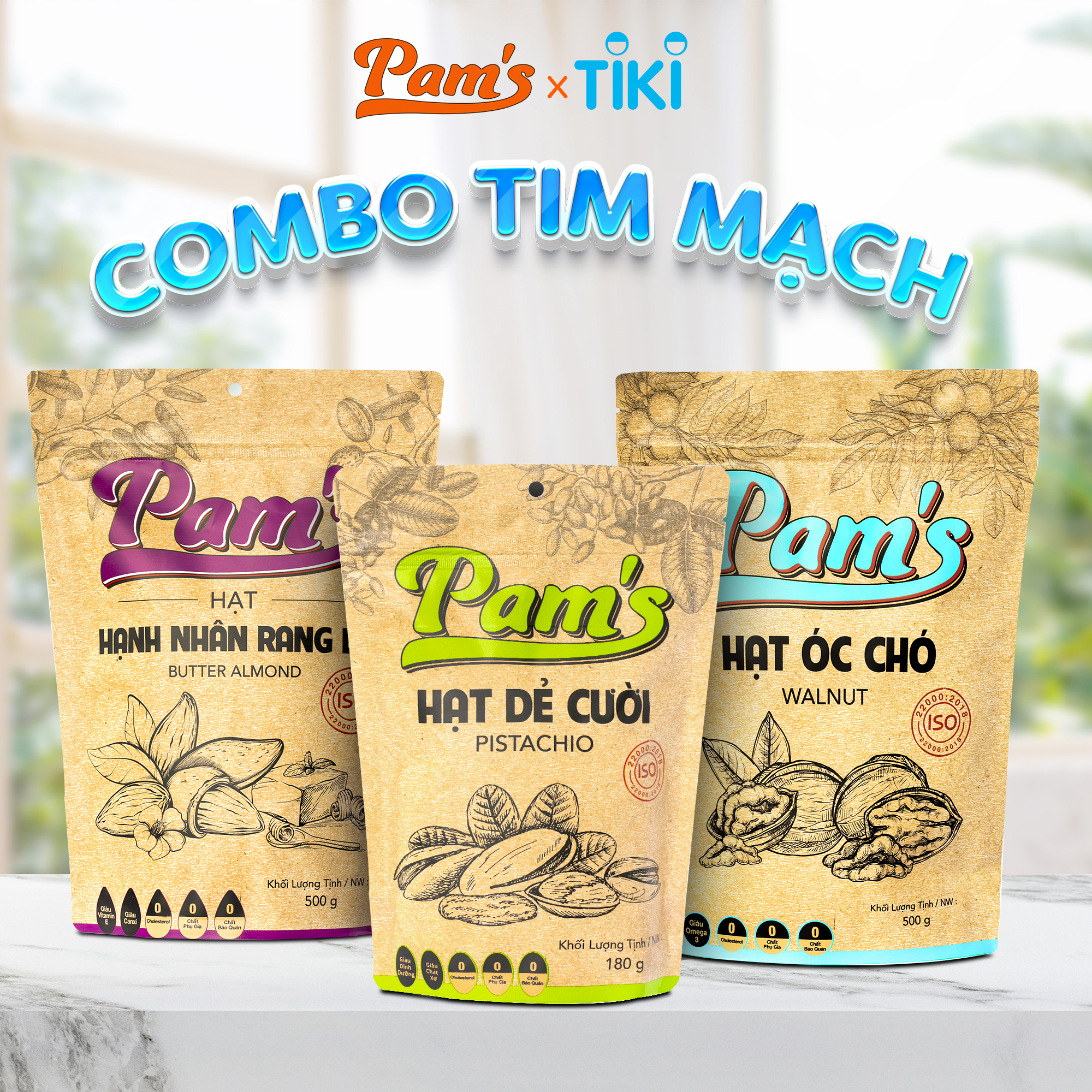 ✨COMBO Chăm Sóc Tim Mạch - Hạt Óc Chó Chile (500g) + Hạnh Nhân Rang Bơ(500g) + Hạt Dẻ Cười(180g) Pam's