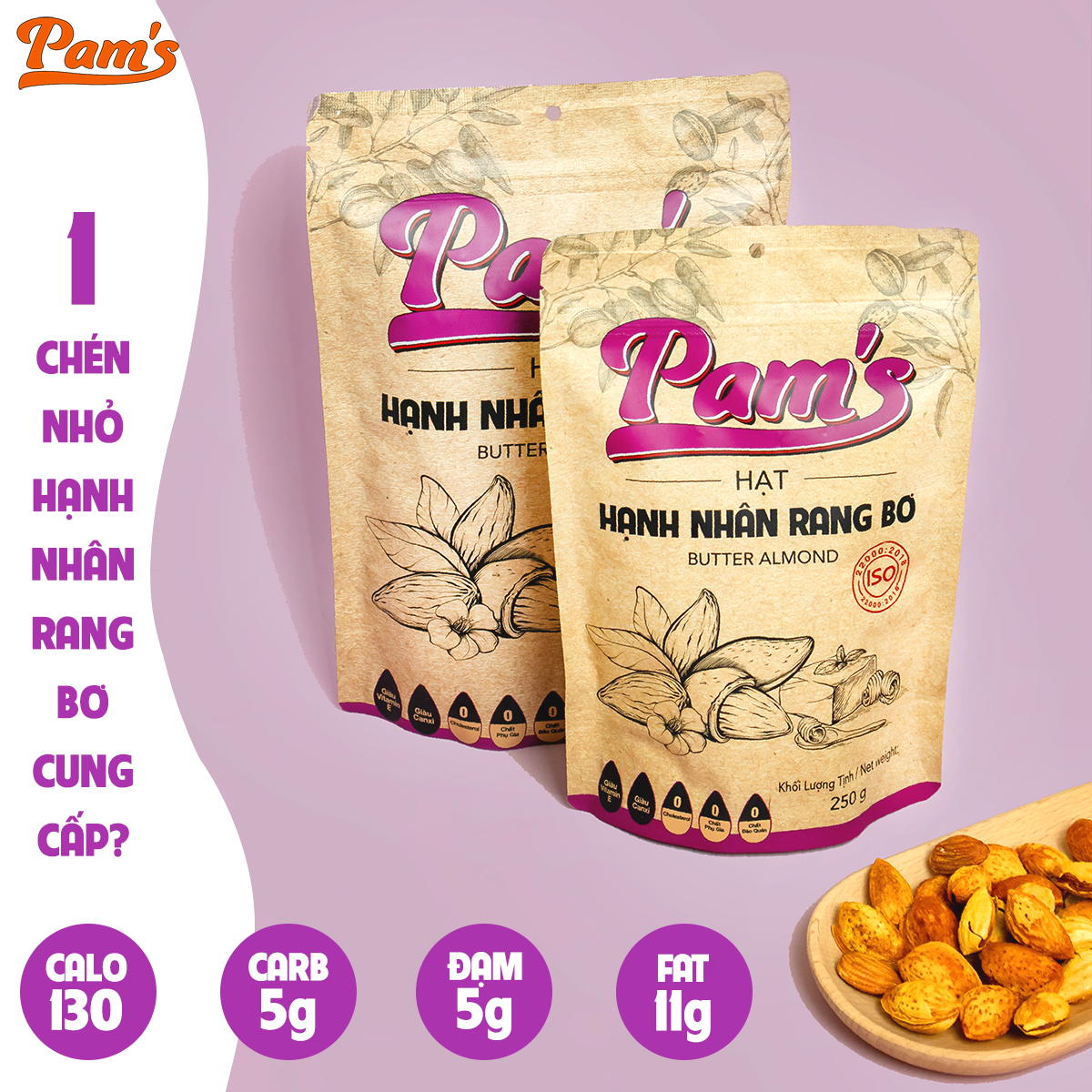 - 100g Hạnh nhân rang bơ Pam's cung cấp: 700 calo, 6g chất béo bão hoà, 17.8g Carbs, 24.5g Protein, 10.5g chất xơ, 0.75g Kali,