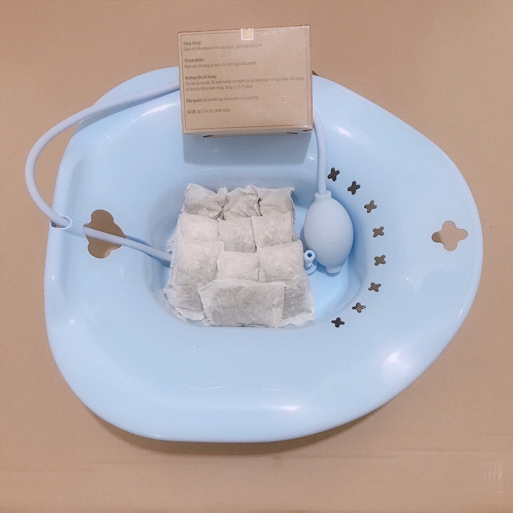 Sản phẩm gồm chậu xông có tay bóp xịt rửa và 1 hộp túi lọc vệ sinh phụ nữ cho mẹ sau sinh: Công dụng: -Lưu thông khí huyết, giảm nhức mỏi, ù
