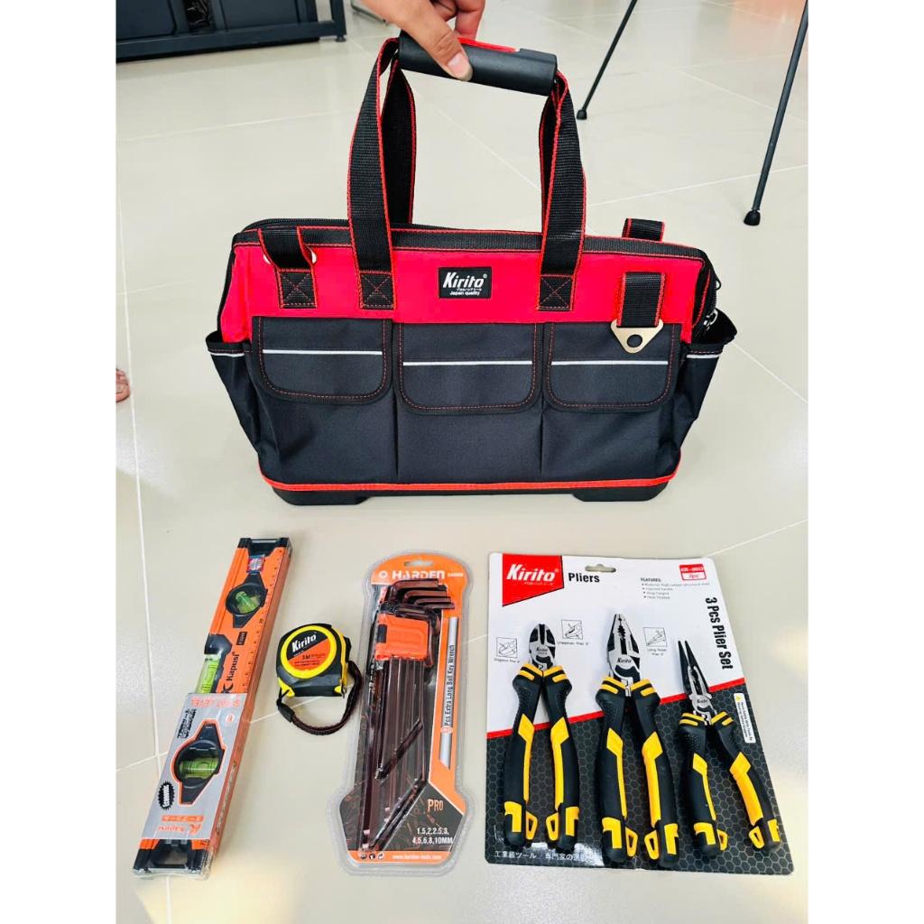 Mua tại TiktokCOMBO ĐỒ NGHỀ SỬA CHỮA TIỆN LỢI – PHÙ HỢP CHO THỢ & HỘ GIA ĐÌNH Túi đựng đồ nghề 20 inch – Thiết kế rộng rãi, đế nhựa giúp tăng độ bền và giữ dáng túi – Có 8 ngăn bên trong + 8 ngăn bên ngoài, giúp sắp xếp dụng cụ gọn gàng, dễ tìm ️ Bộ kìm CRV Kirito gồm: – Kìm điện 8 inch – Kìm cắt 7 inch – Kìm nhọn 6 inch – Chất liệu thép CRV cứng cáp, phù hợp nhiều công việc cơ bản Bộ lục giác màu nâu dài cao cấp – Thiết kế cầm chắc tay, dễ thao tác Thước cuộn 3m + Thước thủy 30cm – Đầy đủ cho các nhu cầu đo đạc thông thường Sản phẩm phù hợp sử dụng cá nhân hoặc công việc sửa chữa cơ bản