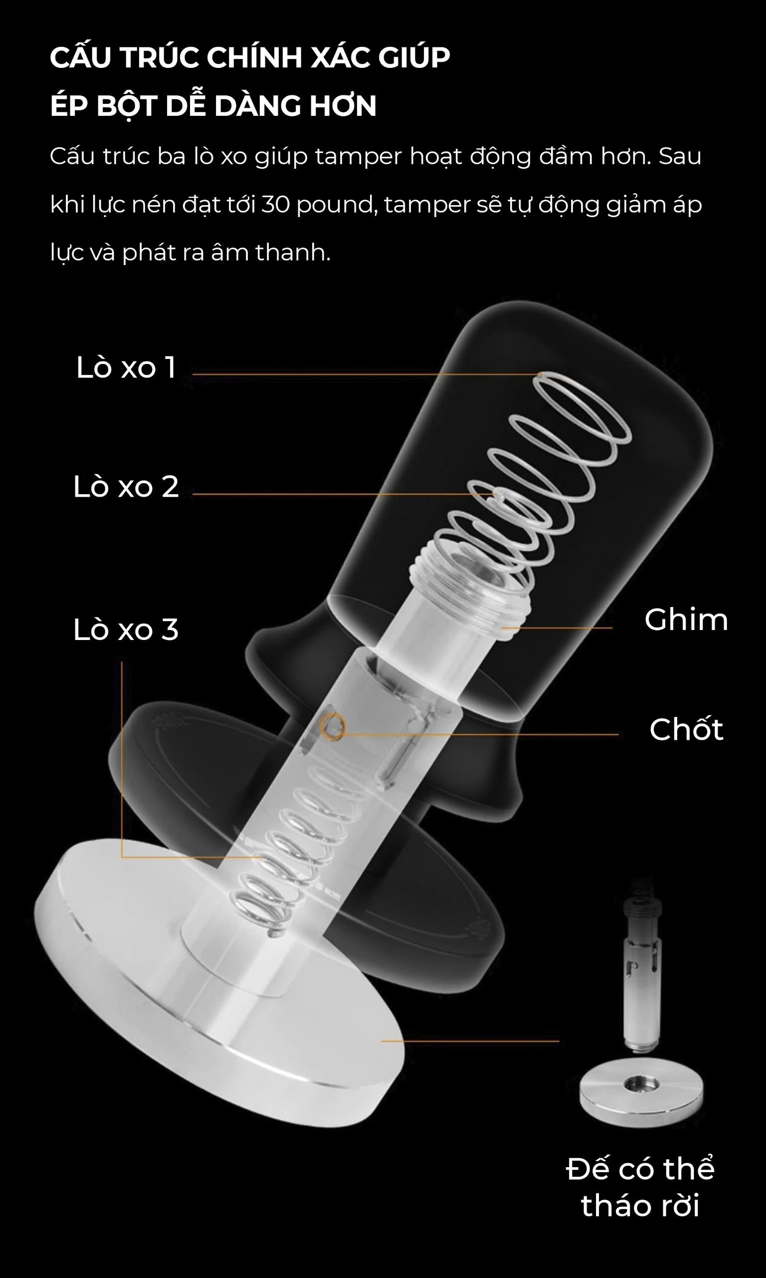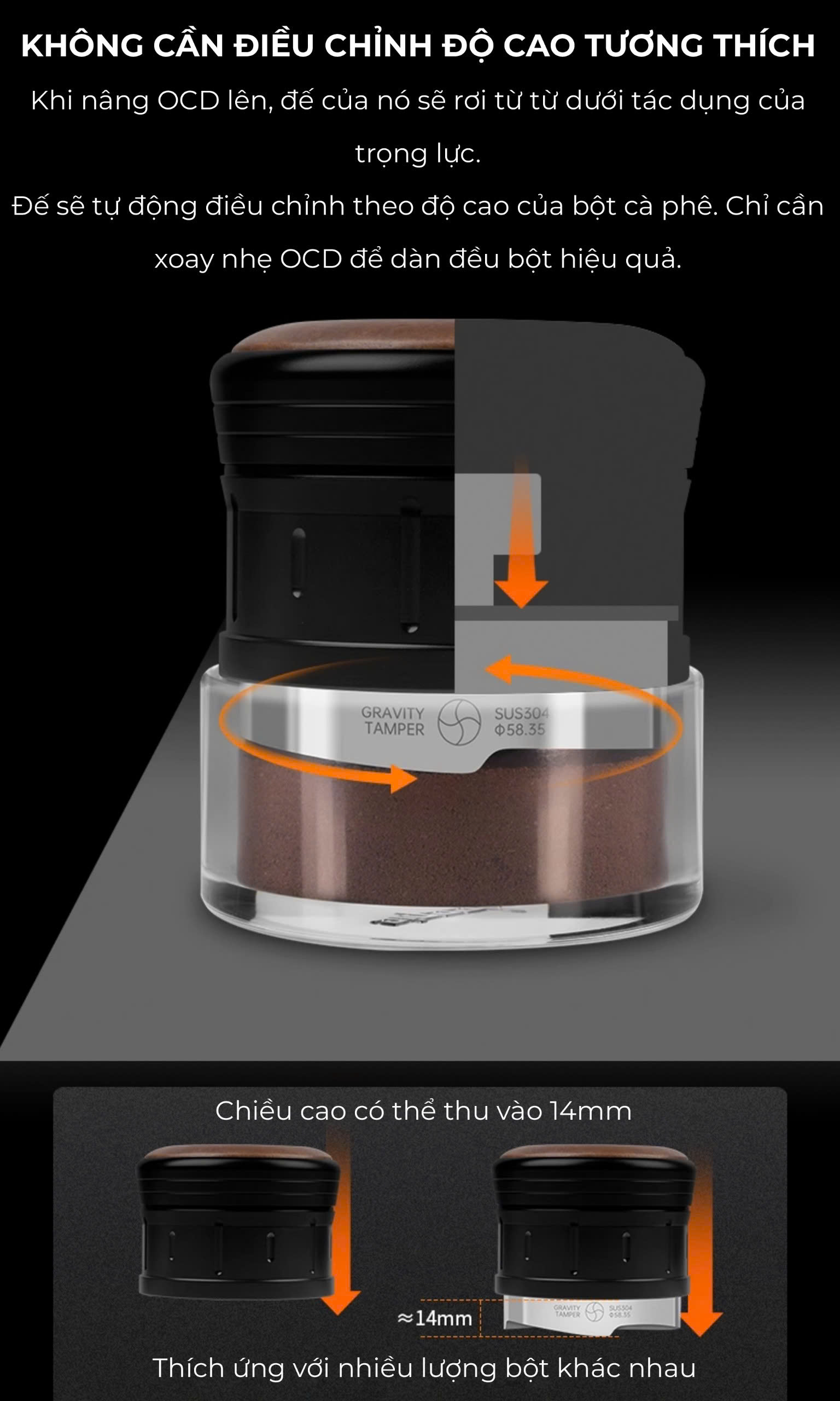 BỘ SẢN PHẨM GỒM Tamper Nén Cố Định Lực Cân Bằng ️ Lực nén 30 lbs ổn định, đảm bảo áp suất đồng đều, hạn chế kênh nước. ️ Phản hồi âm thanh "Click", giúp nhận biết khi đạt lực nén chuẩn. ️ Ba lò xo trợ lực, thao tác dễ dàng, hạn chế rung lắc. ️ Đế inox 304 + tay cầm gỗ óc chó, bền bỉ, sang trọng. Dosing Hứng Đong Cà Phê ️ Giữ bột cà phê không rơi vãi, giúp quầy pha chế luôn sạch sẽ. ️ Thiết kế nắp gỗ óc chó cao cấp, sang trọng và bền bỉ. ️ Chất liệu hợp kim nhôm anodized, chống bám bẩn, dễ vệ sinh. ️ Đường kính 58.5mm, khớp hoàn hảo với giỏ lọc espresso. Kim Xoay Tán Đều Bột ️ 14 kim inox 304 siêu mảnh, giúp phá vỡ khối bột, hạn chế kênh rãnh. ️ Cơ chế xoắn ốc tự động xoay, giúp phân bố bột đồng đều. ️ Tay cầm gỗ + thân hợp kim nhôm, bền bỉ, thao tác dễ dàng. ️ Tương thích tay cầm 58mm, phù hợp với mọi setup barista. OCD San Phẳng Bề Mặt Cà Phê ️ San phẳng bề mặt bột nhanh chóng, đảm bảo nước chảy đều. ️ Điều chỉnh độ sâu vô cấp, linh hoạt cho từng loại cà phê. ️ Tay cầm gỗ óc chó + đế inox 304 chống gỉ sét, thẩm mỹ & bền bỉ. ️ Đường kính 58.5mm, phù hợp giỏ lọc espresso chuyên nghiệp.