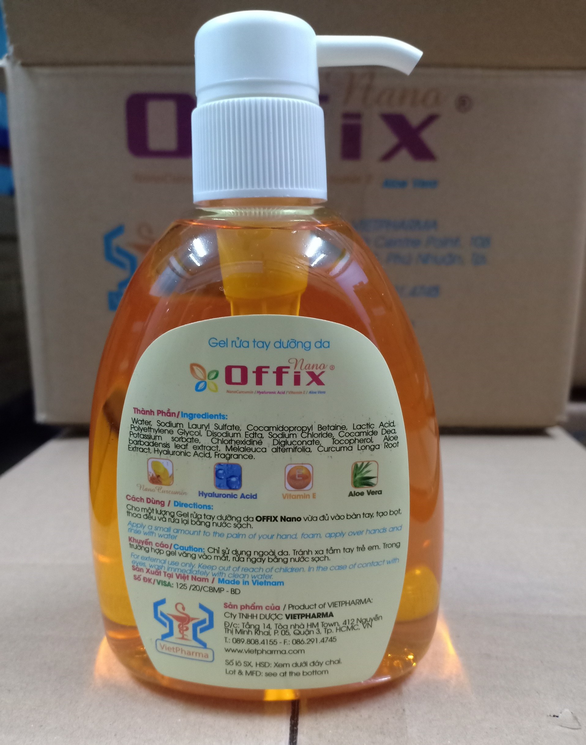- Tea Tree Oil : Giúp sát khuẩn Tá dược khác vừa đủ 300ml. CÔNG DỤNG: Làm sạch da tay, sát khuẩn ngoài ra còn có tác dụng giữ ẩm và dưỡng da cho da tay. CÁCH DÙNG: Thoa một lượng Gel rửa tay dưỡng da OFFIX NANO vừa đủ vào bàn tay, tạo bọt, thoa đều và rửa lại bằng nước sạch. Khuyến cáo: Chỉ sử dụng ngoài da. Tránh xa tầm tay trẻ em. Trong trường hợp gel văng vào mắt rửa ngay bằng nước sạch. Rửa tay ướt: