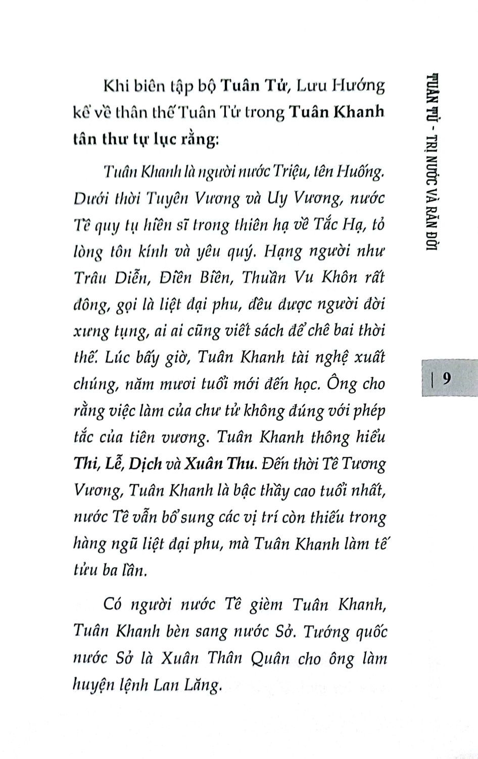 Tuân Tử - Trị Nước Và Răn Đời Thời Tây Hán, Tuân Tử được xếp vào hàng danh nho, địa vị sánh ngang với Mạnh Tử. Tư Mã Thiên viết Sử ký, ghép truyện Mạnh Tử và Tuân Tử chung một thiên, xem hai ông là những người kế thừa xuất sắc của Khổng Tử. Nhưng về sau thì địa vị của Mạnh Tử lại vượt hơn. Cũng từ thời Bắc Tống, lý học ngày càng phát triển, Tuân Tử càng bị chỉ trích gay gắt. Nhìn chung, có hai nguyên nhân khiến Tuân Tử bị chỉ trích: một là bởi thuyết tính ác, hai là bởi Hàn Phi và Lý Tư. Nạn đốt sách chôn nho dưới thời Tần Thủy Hoàng, các nhà nho đời sau quy hết trách nhiệm cho Hàn Phi và Lý Tư. Tuân Tử là thầy của họ, đương nhiên không tránh khỏi liên lụy. Trình Di (1033-1107) nhận xét: Tuân Tử không thuần chính cực độ, chỉ một câu tính ác, gốc lớn của Nho gia đã mất rồi. Trong bài Tuân Khanh luận, Tô Đông Pha (1037-1101) nói: Tuân Khanh ưa chuộng dị thuyết mà không biết khiêm nhường, dám luận bàn cao xa mà không biết xem xét. Lời lẽ của ông ta, hạng người ngu thì kinh sợ, kẻ tiểu nhân thì thích thú. Sau Cách mạng Tân Hợi (1911), khi phong trào Tân văn hóa đang phát triển mạnh mẽ, trong bài Độc Tuân Tử thư hậu của Ngô Ngu (1872-1949) đăng trên Tân thanh niên ngày 1 tháng 3 năm 1917, Tuân Tử bị phê phán: Đọc sách của Tuân Khanh, thấy tông chỉ là đề cao quân vương, hạ thấp bề tôi, làm cho dân chúng ngu muội... Nền chuyên chế ở Trung Hoa do Tần Thủy Hoàng lập nên, có Lý Tư giúp sức, nhờ Tuân Khanh gợi mở, được Khổng Tử dạy cho. Gần nửa thế kỷ sau, Tuân Tử mới được đánh giá khách quan hơn, những đóng góp của ông với triết học Trung Hoa mới được ghi nhận đầy đủ: Tuân Tử tiếp thu rộng rãi tinh hoa tư tưởng của các nhà, đồng thời nghiêm khắc phê phán họ, kể cả một số học phái của Nho gia. Đáng chú ý nhất là việc Tuân Tử phê phán học phái của Tử Tư và Mạnh Tử, đó là đỉnh cao của cuộc đấu tranh giữa chủ nghĩa duy vật với chủ nghĩa duy tâm thời Chiến Quốc. Do vậy, Tuân Tử xứng đáng được xem là người tổng kết triết học cổ đại.