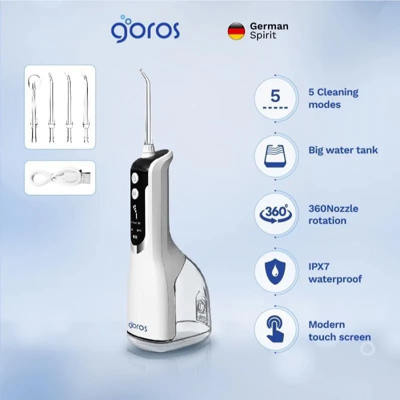 - Màn hình LCD hiện thị thông minh -Công nghê HydroPulse kết hợp giữa áp lực nước và nhịp phun phù hợp. THÔNG TIN CHI TIẾT SẢN PHẨM: Tên sản phẩm: Máy tăm nước Goros Aqua360 Thương hiệu: GOROS Màu sắc: Trắng, Đen Dung lượng pin: 2200 mAh Dung tích ngăn chứa nước: 330 ml Thời gian sạc: 3-4 h Áp lực nước định mức: 30 -90 psi Điều chỉnh bánh răng: 5 chế độ làm sạch Lớp chống nước: IPx7 BẢNG KÊ HÀNG HÓA: 1 Máy tăm nước Đầu làm sạch 4 1 Loại – C Dây sạc 1 Hướng dẫn sử dụng