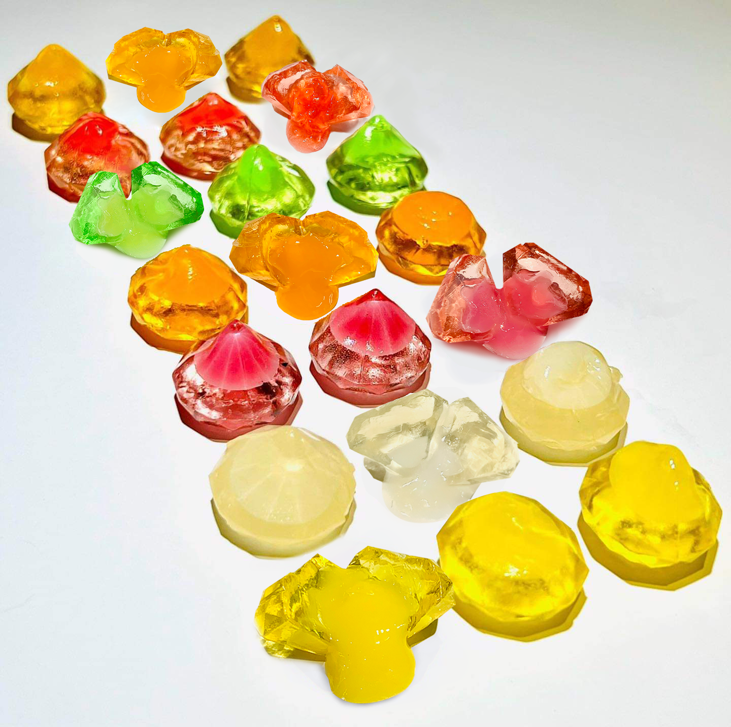 Kẹo thạch có hình kim cương đẹp mắt, bên ngoài mềm mịn cắn vào sẽ có một lớp nhân sốt trái cây tan chảy thơm ngon. Sốt được làm hoàn toàn 100% từ trái cây thật, đảm bảo an toàn và vị ngon tuyệt vời.