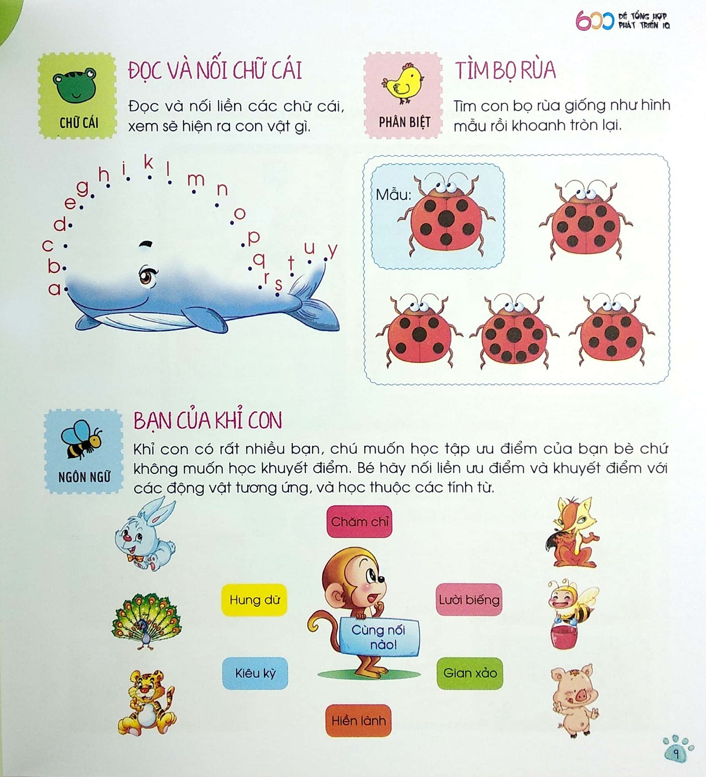 Những con số vui nhộn trong phép tính hình như đang nóng lòng chờ bé giải rồi kìa. Làm cách nào để các bé nhận biết nguyên âm, phụ âm, câu dài, câu ngắn, cách viết một đoạn văn hay hoặc nhận biết về thế giới xung quanh nhỉ? Nhưng đừng lo nhé, 600 Đề vui học phát triển toàn diện không những giúp các bé vừa chơi vừa học một cách thú vị mà còn rất hiệu quả đấy.