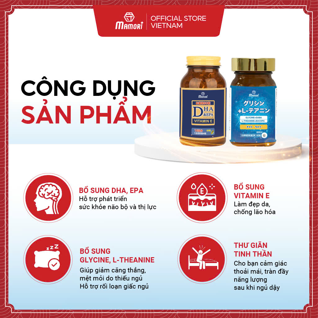 Mua tại TiktokCombo viên uống MAMORI DHA - EPA và Glycine L-theanine là giải pháp hoàn hảo để chăm sóc giấc ngủ và phát triển trí tuệ. Viên uống DHA - EPA từ Nhật Bản hỗ trợ sức khỏe não bộ, cải thiện trí nhớ, và bảo vệ tim mạch, trong khi Glycine, L-theanine giúp giảm căng thẳng, mang đến giấc ngủ sâu hơn. Đây là lựa chọn lý tưởng để nâng cao sức khỏe não bộ và chất lượng giấc ngủ cho bạn và gia đình. 1.1 Thành phần chính trong Viên uống Mamori DHA, EPA, Vitamin E: