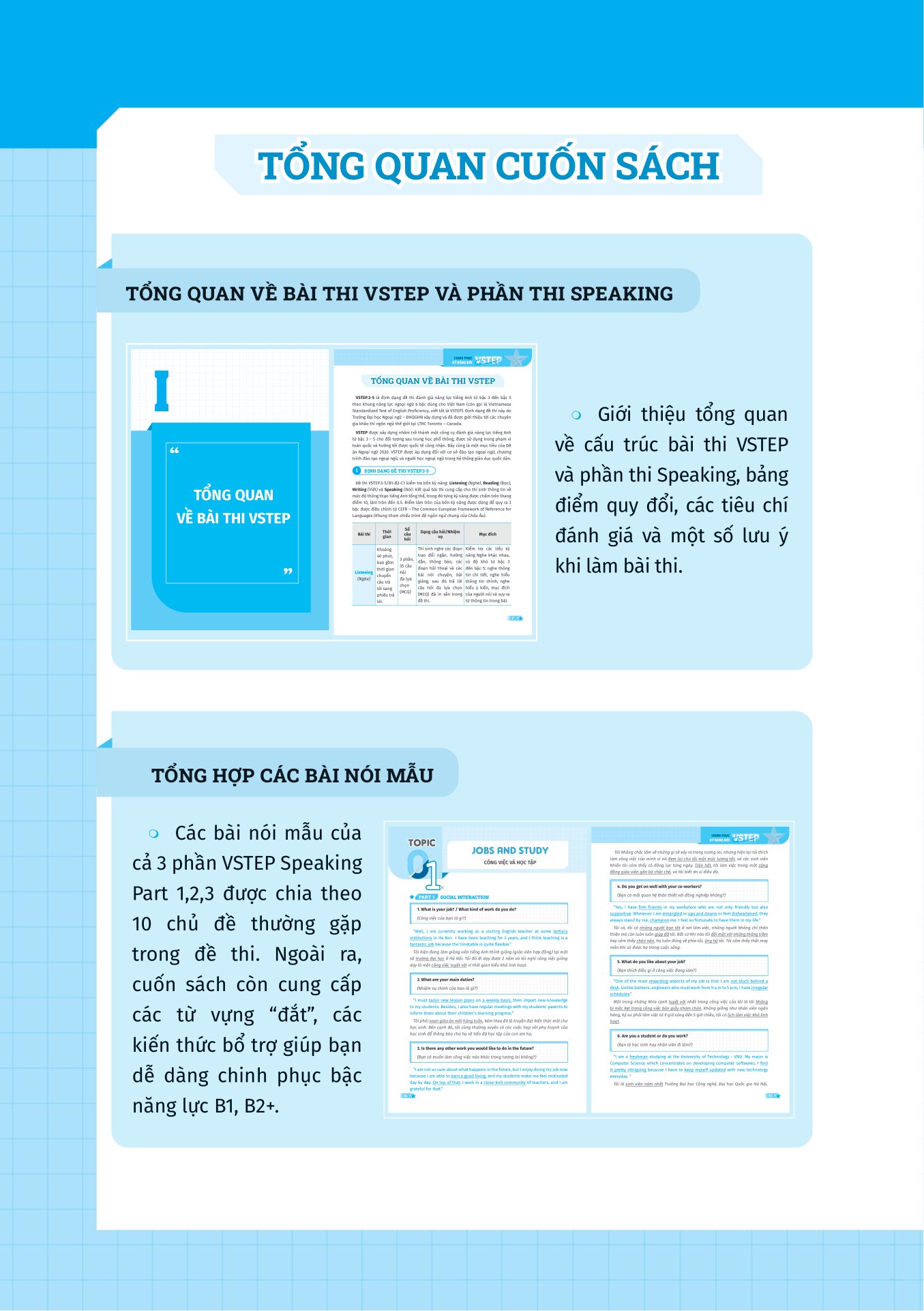 Cuốn sách được chia thành 10 bài học, mỗi bài học tập trung vào 1 chủ đề người học thường gặp trong kì thi VSTEP. Trong đó, mỗi chủ đề được chia thành 3 phần:
