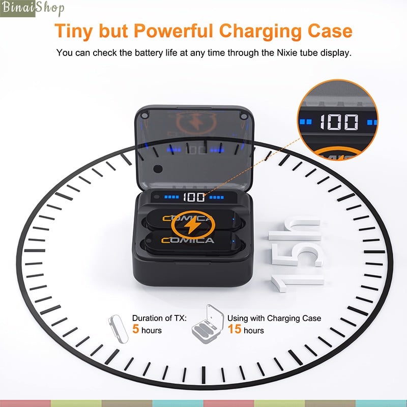 - Sách hướng dẫn THÔNG SỐ KỸ THUẬT Name Product Vimo S Wireless Type 2.4GHz Built-in Transmitting Power 10dBm Sensitivity -32±2dB Polar Pattern Omnidirectional Frequency Response 80Hz - 20kHz S/N 70dB Equivalent Noise 24dBA Maximum SPL 110dB Dynamic Range 86dB Sound Delay <20ms Battery TX: Built-in Li-on Battery 95mAh 3.8V Charging Case: Built-in Li-on Battery 800mAh 3.8V Charging Time TX: 2 Hours Charging Case: 2 Hours Standby Time TX: 5 Hours Charging Case: 2 times for two transmitter Net Weight TX: 10g RX: 12g Charging Case: 53g Dimension TX: 16 x 16 x 50mm RX: 12 x 26.5 x 33mm Charging Case: 29 x 58.5 x 63mm Keyword: Comica Vimo S, micro comica, comica vimo s (mi), comica vimo s (uc), micro cài áo, micro không dây, micro cài áo cho điện thoại.