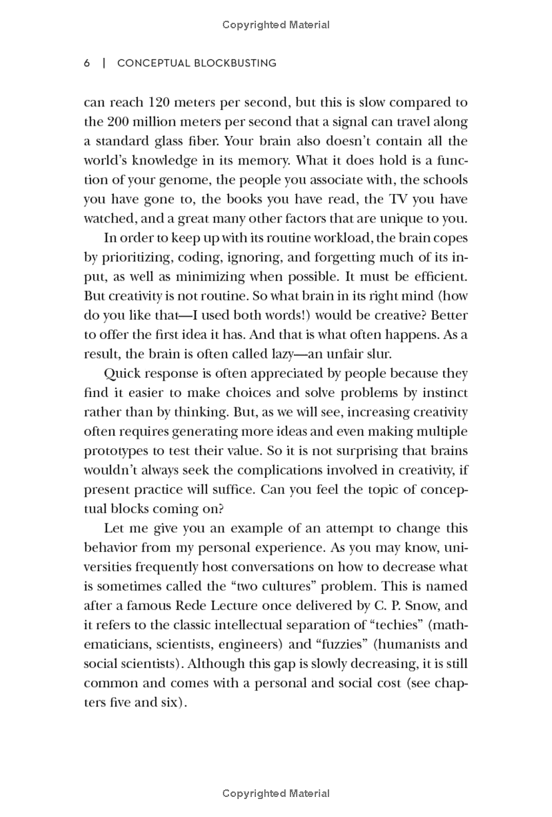More than three decades after its original publication, Conceptual Blockbusting has never been more relevant, powerful, or fresh. Integrating insights from the worlds of psychology, engineering, management, art, and philosophy, Adams identifies the key blocks (perceptual, emotional, cultural, environmental, intellectual, and expressive) that prevent us from realizing the full potential of our fertile minds. Employing unconventional exercises and other interactive elements, Adams shows individuals, teams, and organizations how to overcome these blocks, embrace alternative ways of thinking about complex problems, and celebrate the joy of creativity. Completely revised and updated with the latest cognitive science and addressing new subjects such as changes in technology, creativity in large groups, and sustaining creativity over time, Conceptual Blockbusting will introduce a new generation of readers to a world of new possibilities.