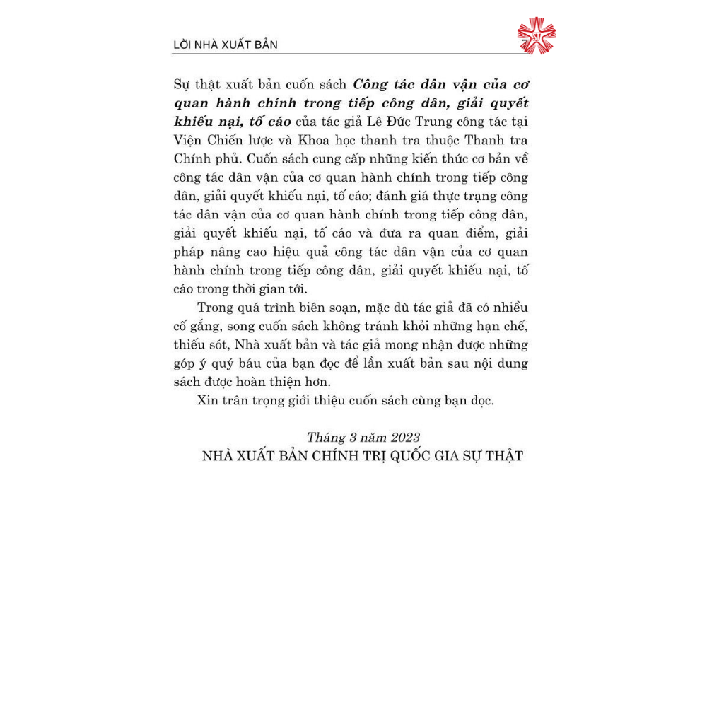Cuốn sách Công tác dân vận của cơ quan hành chính trong tiếp công dân, giải quyết khiêu nại, tô cáo của tác giả Lê Đức Trung công tác tại Viện Chiến lược và Khoa học thanh tra thuộc T Ch.ính ph.ủ. Cuốn sách cung câp những kiến thức cơ bản về
