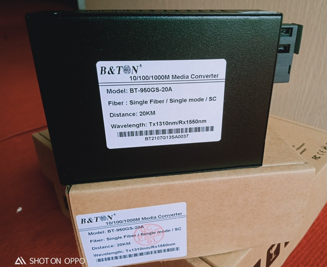 10/100/1000Mbps. Model: BT-950GS-20A/B. Series là một loại thiết bị chuyển đổi quang điện thông minh, adaptive và nhanh Ethernet. Nó có thể thực hiện truyền dữ liệu giữa các tín hiệu điện tử xoắn đôi và tín hiệu quang học là hai loại phương tiện kết nối mạng.Các loại bộ chuyển đổi phương tiện truyền thông có thể mở rộng khoảng cách truyền đến 0,55 km (đa chế độ) hoặc 120 km (một chế độ) bằng cách sử dụng công cụ chuyển đổi phương tiện truyền thông là một giải pháp kinh tế để đạt được cơ sở truyền dẫn đường dài dựa trên tình trạng hiện tại.