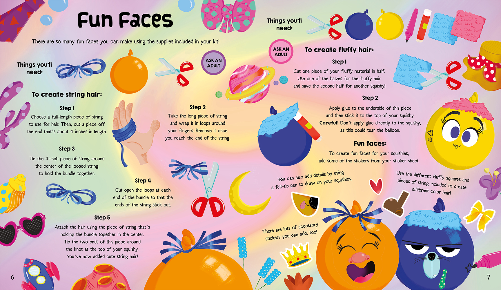 Create 10 homemade squishies using this 21-piece set, which includes balloons, glue, plushes, felt accessories, stickers, a design book and more