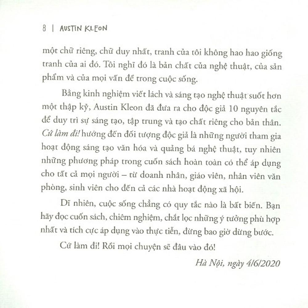 Trong những cuốn sách trước – Steal Like An Artist (Tạm Dịch: Trộm Cắp Như Một Nghệ Sĩ) và Nghệ Thuật PR Bản Thân – Austin đã dạy độc giả cách vay mượn để trở nên sáng tạo và rồi chia sẻ thế nào để được tìm thấy. Trong Cứ Làm Đi!, Austin tiếp tục đưa ra 10 cách để duy trì sự sáng tạo, tập trung và chất riêng của bản thân mình: