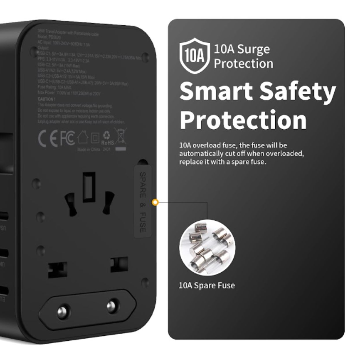 - Bộ sản phẩm đi kèm đến 4 chuẩn jack cắm, là 4 chuẩn ổ cắm phổ biến được các quốc gia trên thế giới sử dụng hiện nay. Việc cho phép thay đổi đầu cắm khác, cho phép người dùng có thể sử dụng bộ sạc ở hơn 200 quốc gia và khu vực khác nhau trên thế giới mà không gặp vấn đề gì.