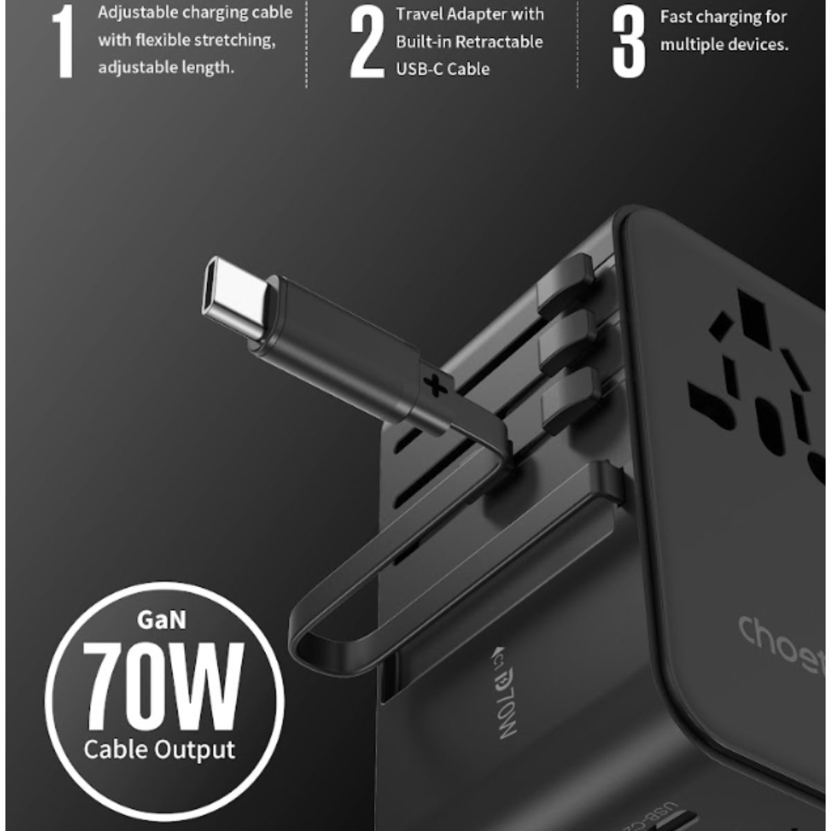 Củ sạc Choetech PD5020 du lịch đa năng tích hợp thêm dây cáp sạc Type C (35W)/ PD5021 (45W)/ PD5022 (70W)- Hàng chính hãng