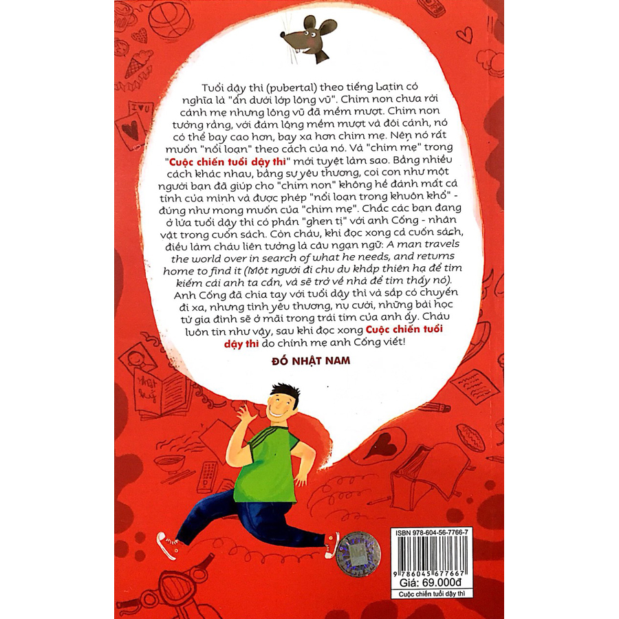 Tuổi dậy thì (pubertal) theo tiếng Latin có nghĩa là “ẩn dưới lớp lông vũ”. Chim non chưa rời cánh mẹ nhưng lông vũ đã mềm mượt. Chim non tưởng rằng, với đám lông mềm mượt và đôi cánh, nó có thể bay cao hơn, bay xa hơn chim mẹ. Nên nó rất muốn “nổi loạn” theo cách của nó. Và “chim mẹ” trong “Cuộc chiến tuổi dậy thì” mới tuyệt làm sao. Bằng nhiều cách khác nhau, bằng sự yêu thương, coi con như một người bạn đã giúp cho “chim non” không hề đánh mất cá tính của mình và được phép “nổi loạn trong khuôn khổ” - đúng như mong muốn của “chim mẹ”. Chắc các bạn đang ở lứa tuổi dậy thì có phần “ghen tị” với anh Cống - nhân vật trong cuốn sách. Còn cháu, khi đọc xong cả cuốn sách, điều làm cháu liên tưởng là câu ngạn ngữ: A man travels the world over in search of what he needs, and returns home to find it (Một người đi chu du khắp thiên hạ để tìm kiếm cái anh ta cần, và sẽ trở về nhà để tìm thấy nó). Anh Cống đã chia tay với tuổi dậy thì và sắp có chuyến đi xa, nhưng tình yêu thương, nụ cười, những bài học từ gia đình sẽ ở mãi trong trái tim của anh ấy. Cháu luôn tin như vậy, sau khi đọc xong Cuộc chiến với tuổi dậy thì do chính mẹ anh Cống viết! - Đỗ Nhật Nam