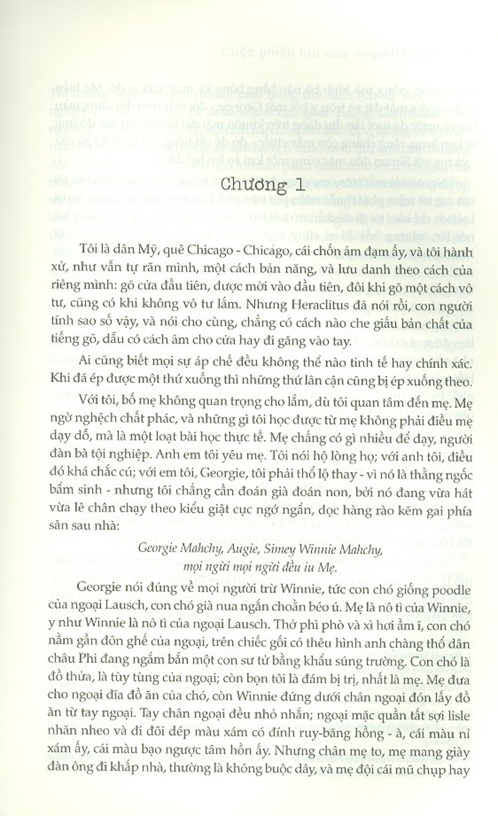 Với Cuộc phiêu lưu của Augie March, Saul Bellow đã kể lại hành trình độc nhất vô nhị của người hùng du đãng picaresque Augie March: một thanh niên thậm duyên dáng, một kẻ cơ hội chủ nghĩa xảo trá, một gã khờ trong lưới tì Rời bỏ xuất thân Do Thái di cư nghèo khổ, Augie March hăm hở bước vào công cuộc tìm kiếm lẽ sống của đời mình dưới các ống cống và nhà ga tại Chicago, quẩn quanh những trường đại học ở New York, hay ngoài rừng rậm Mexico giữa bầy thằn lằn hoang dã Hành trình phi thường của Augie March là biểu tượng cho sự tái sinh lý tưởng tự do của giấc mơ Mỹ, và đặc biệt hơn, đã “viết lại” ngôn ngữ của cả một thế hệ.