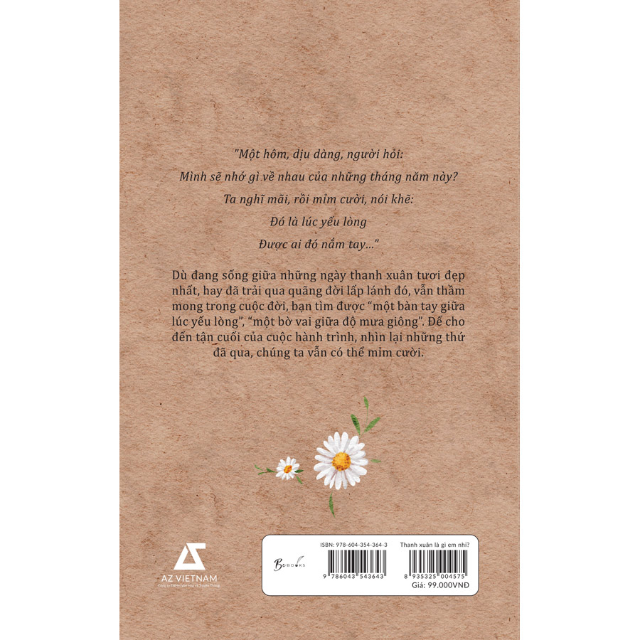 “Thanh xuân là gì em nhỉ?” sẽ không ngợi ca nỗi buồn, cũng không cảm tụng niềm vui. Đó là những dư vị thanh xuân còn sót lại trên hành trình trưởng thành của mỗi người, mà đâu đó bạn sẽ gặp phải. Lật mở từng trang sách, bạn sẽ bắt gặp cảm xúc của chính mình, giống như sau bao năm gặp lại một người bạn cũ, chỉ để bình thản ngồi bên nhau uống một tách trà, yên lòng thấy nhau vẫn ổn. Và đôi khi nhắc nhỡ nhau rằng, thanh xuân ấy, đã được chúng ta cùng tô lên thật nhiều màu sắc.