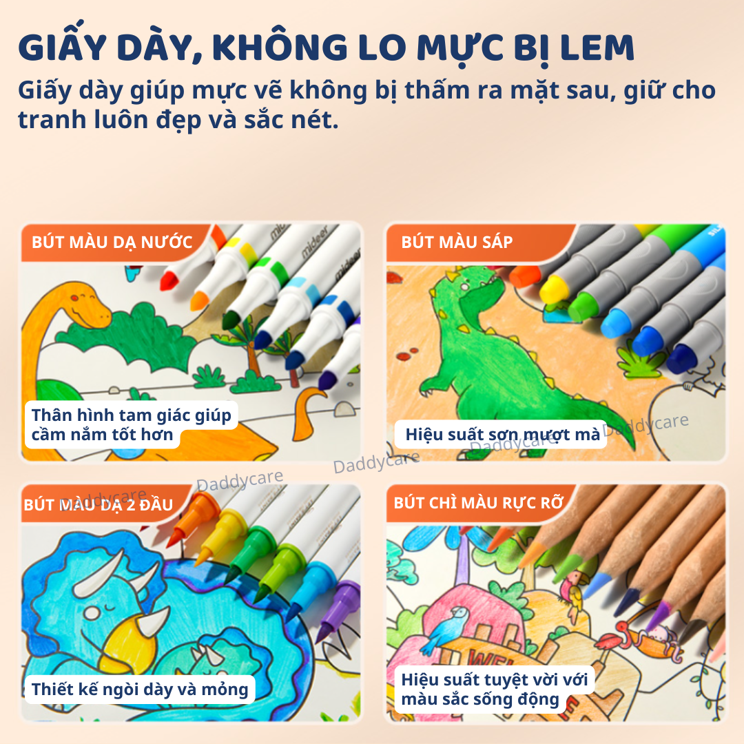 - GIẤY DÀY, KHÔNG LO MỰC BỊ LEM: Giấy dày giúp mực vẽ không bị thấm ra mặt sau, giữ cho tranh luôn đẹp và sắc nét.