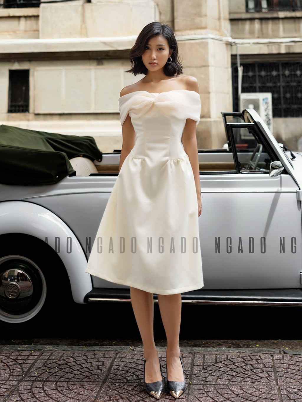 ✨Đầm bẹt vai phối voan kem NGADO, Đầm dự tiệc sang chảnh, Đầm hở vai