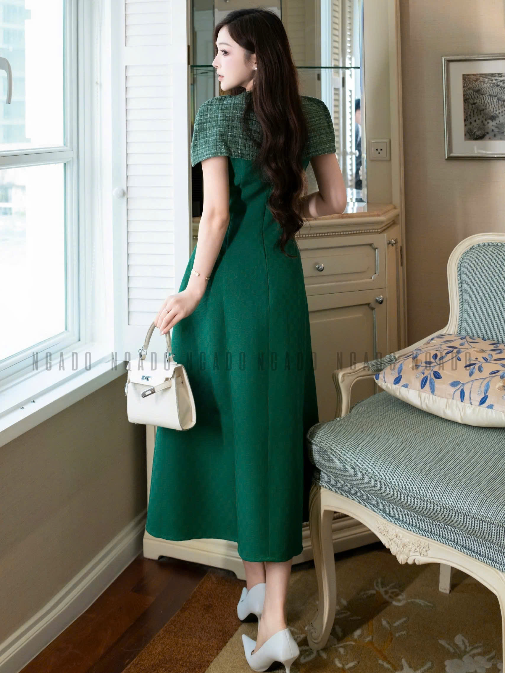 ✨Đầm xanh lá phối tweed NGADO , đầm dự tiệc dáng dài , đầm thiết kế