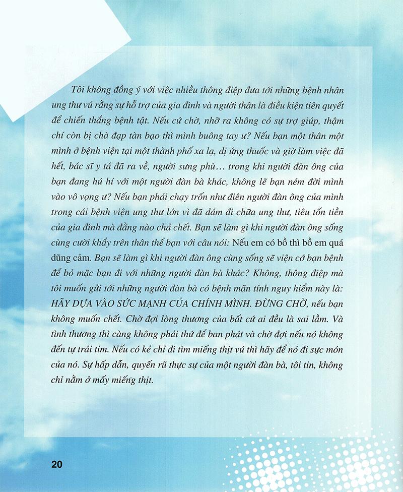 Đối với những người phụ nữ, bà gửi gắm thông điệp, đừng phụ thuộc vào đàn ông: HÃY DỰA VÀO SỨC MẠNH CỦA CHÍNH MÌNH. ĐỪNG