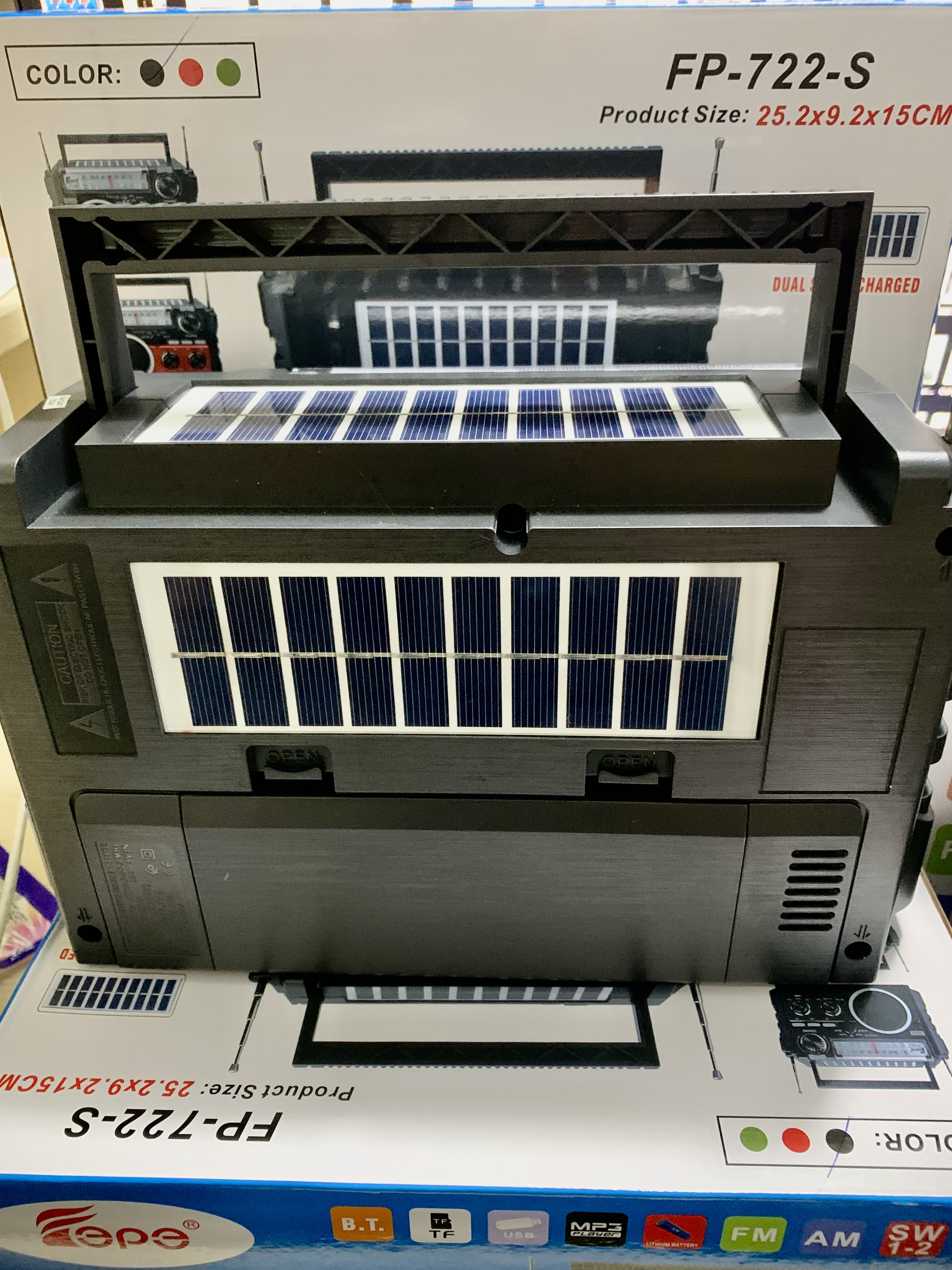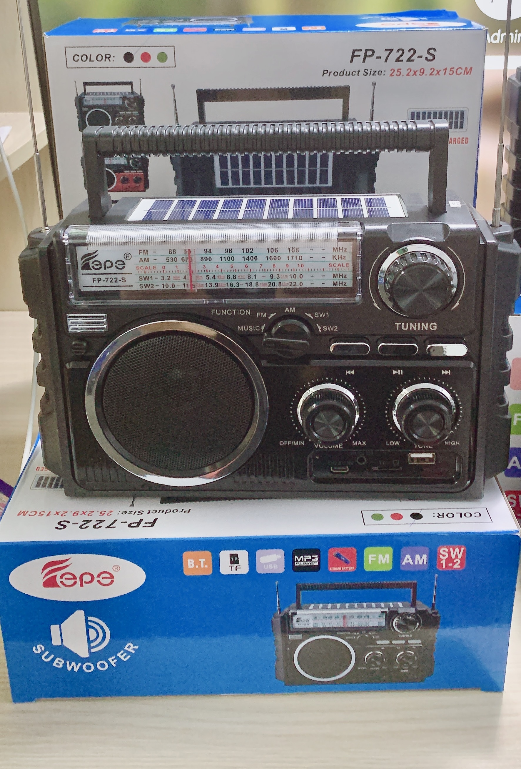 Thông tin kỹ thuật Sản Phẩm Đài FM Radio Bluetooth Năng Lượng Mặt Trời FP-722-S - Hãng : Fepe - Model: Fp-722-S - Radio 3 Bands AM / FM / SW - Tích