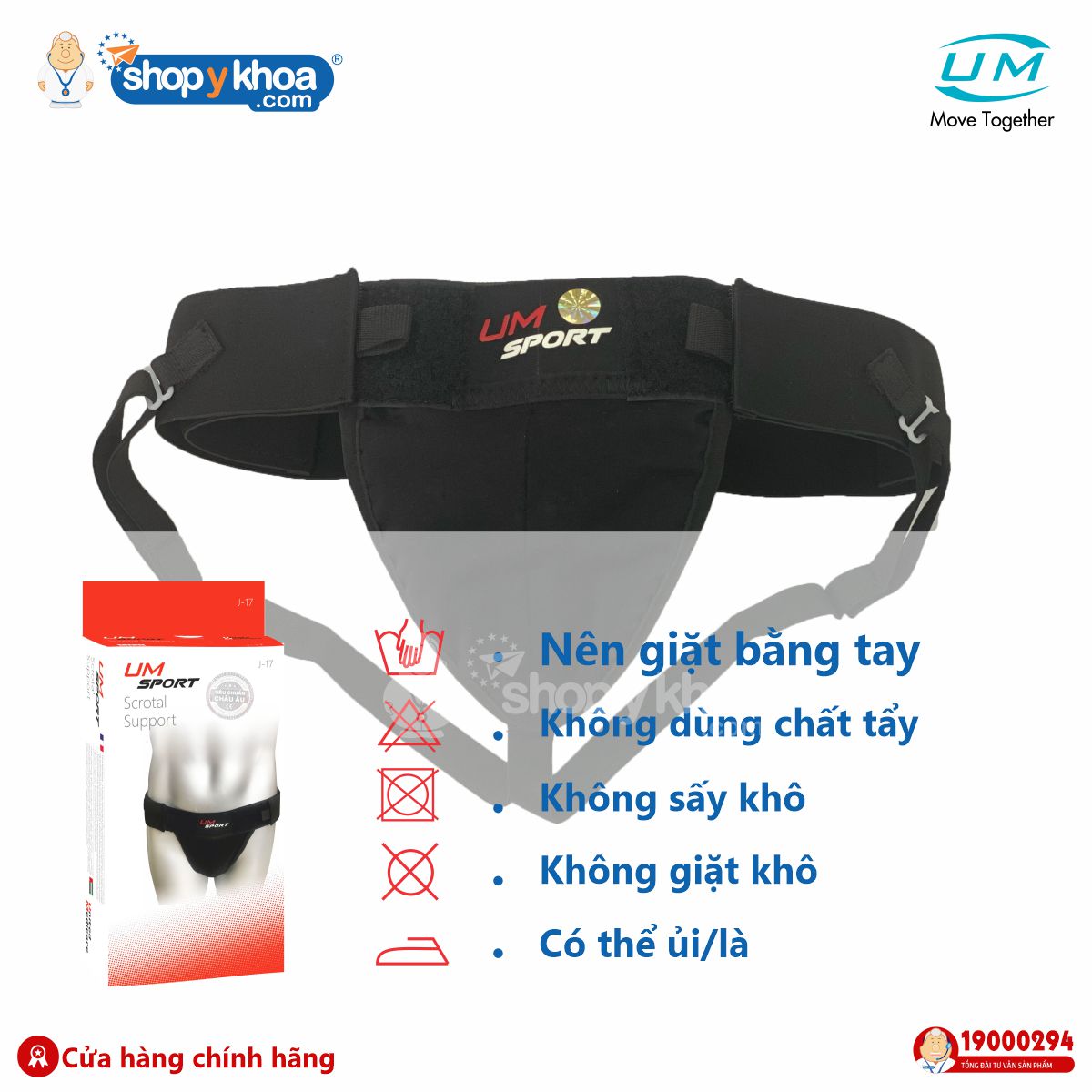 CHỈ ĐỊNH Đai thoát vị bẹn, nâng bìu UM (J17) có kiểu dáng rộng rãi, thoải mái, cung cấp đủ không gian, hỗ trợ hiệu quả cho thoát vị bẹn kèm túi nâng bìu riêng biệt. ĐẶC TÍNH VÀ HỖ TRỢ